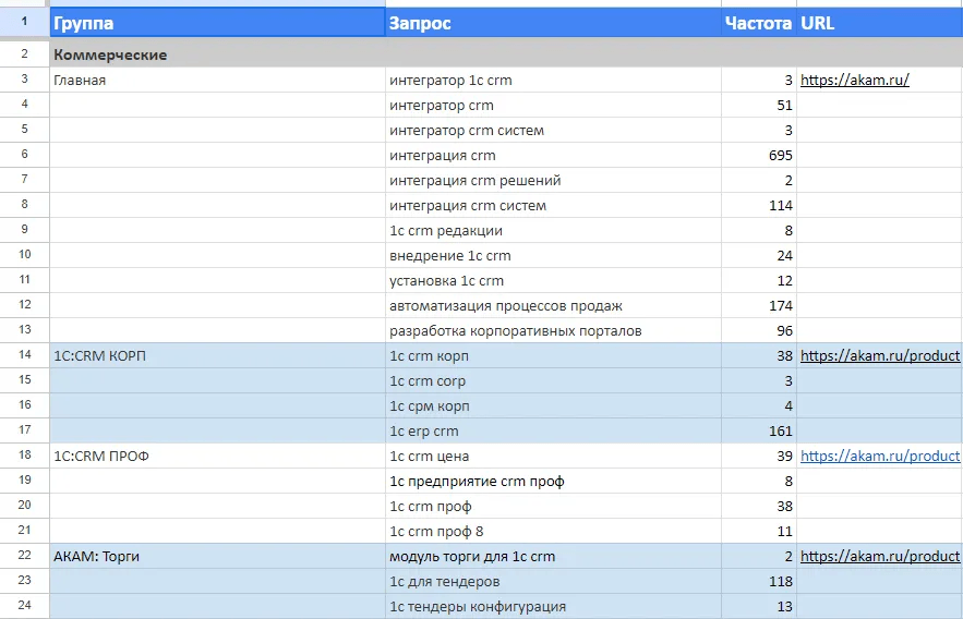 Ключевые запросы сгруппировали и собрали в один файл для удобства дальнейшей работы.