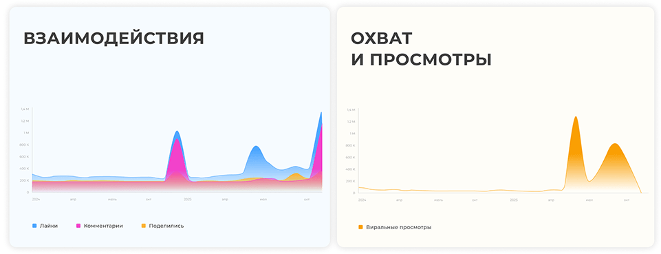 Средние виральные охваты публикаций — 20–300 тыс. (было 1–2 тыс.).