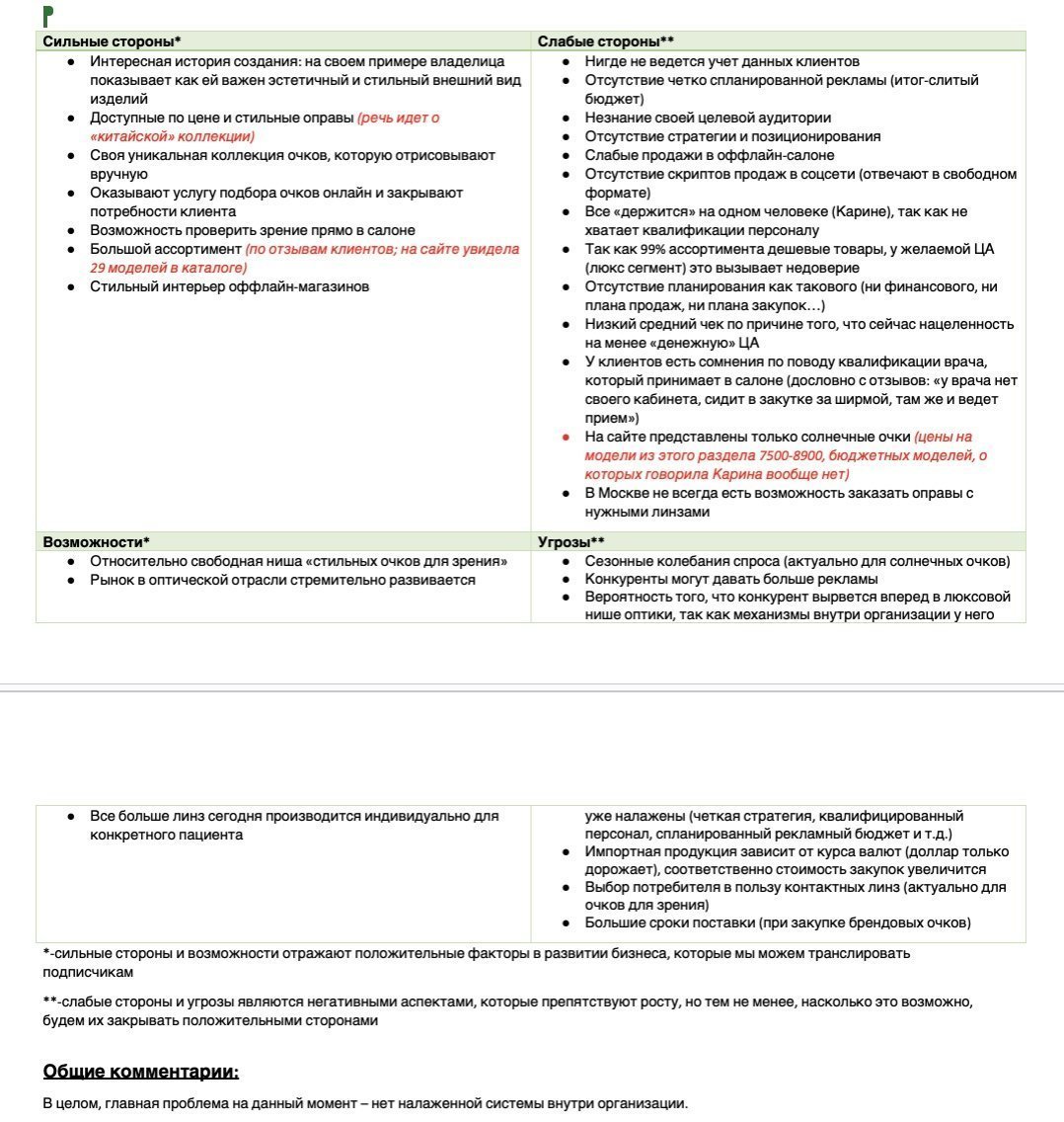 Итогом нашей аналитической работы стал сводный SWOT-анализ бренда. В нем мы отметили ключевые проблемы, почему у сети оптик таки не складывалось с SMM: