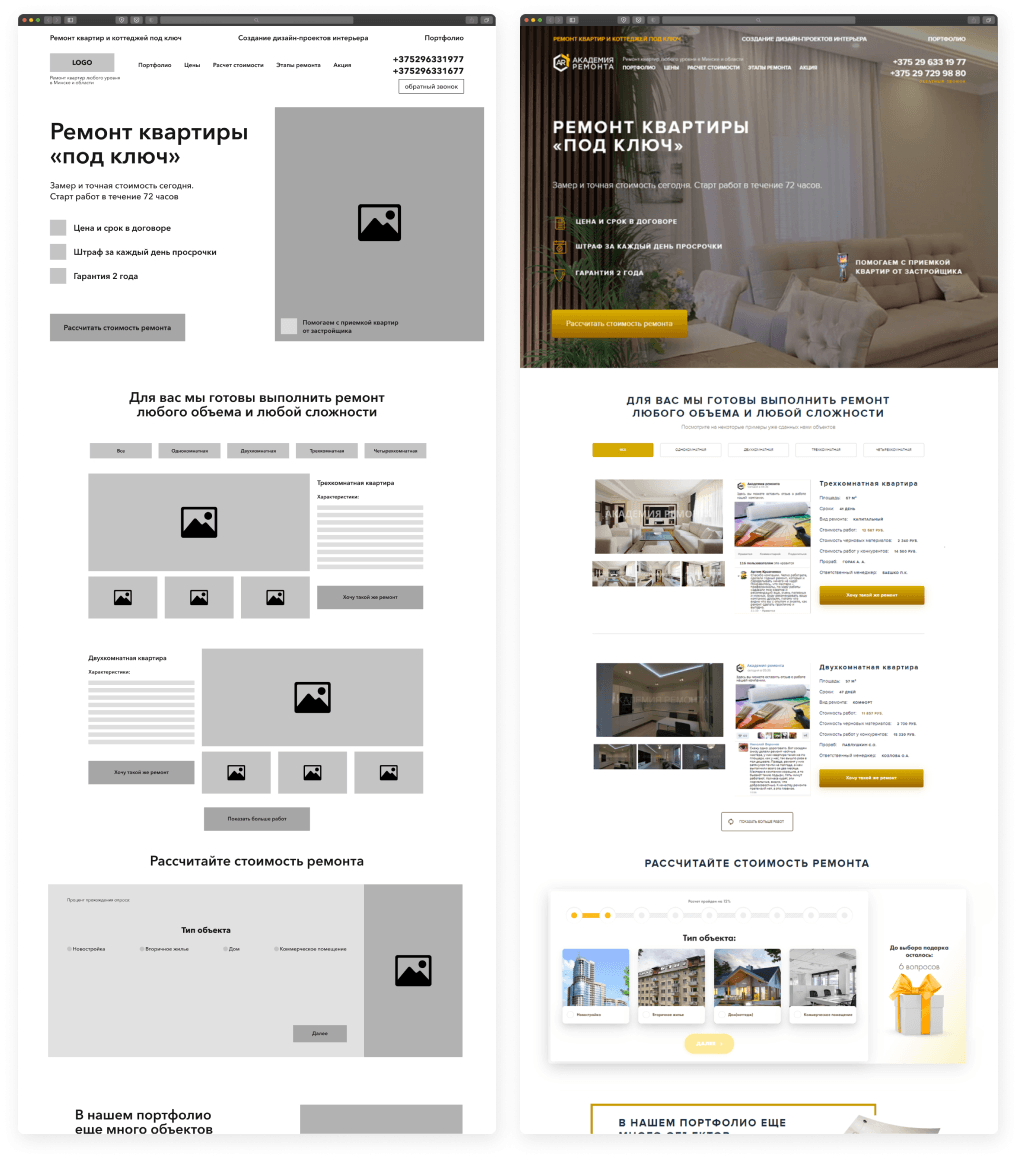 На этапе прототипирования мы выстроили логику движения пользователя: от первого касания до заявки. Каждый блок отвечал на конкретный вопрос или возражение – от стоимости до сроков и гарантий.