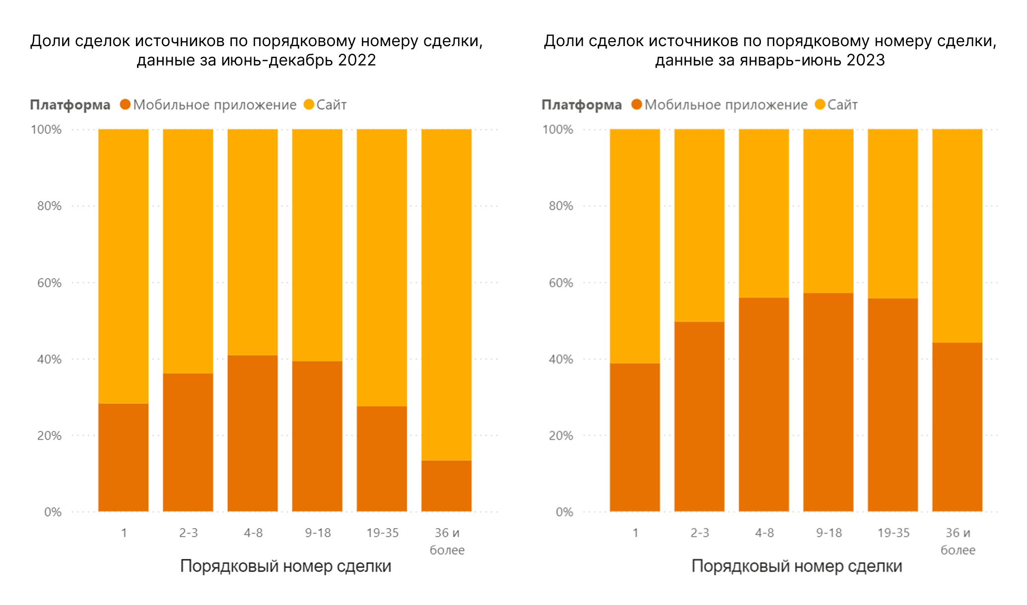 Если сравнить данные за 2022 и 2023, то увидим, что доля мобильного приложения растет особенно для клиентов с большим количеством сделок.