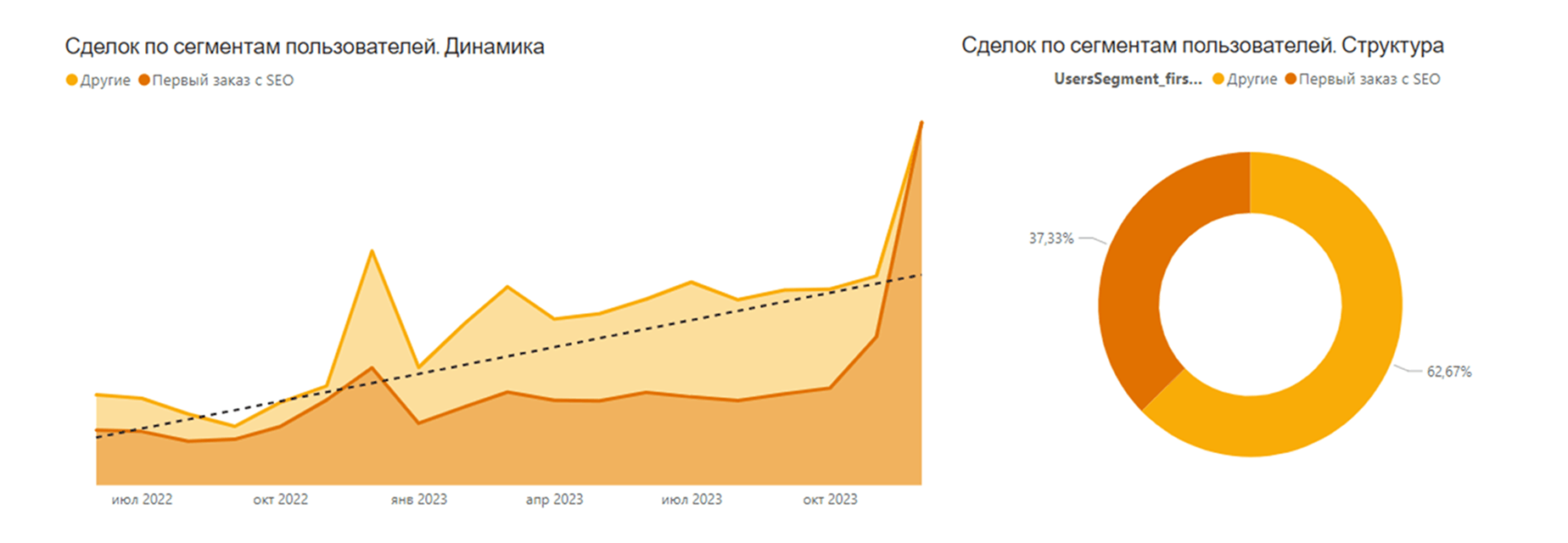 С помощью данных Яндекс.Метрики высчитали сегмент пользователей, которые пришли с SEO и впервые что-то купили в мобильном приложении. По модели атрибуции смотрели последний значимый переход. Во второй половине 2022 года и в 2023 году доля сделок пользователей с SEO в мобильном приложении составила 37%.