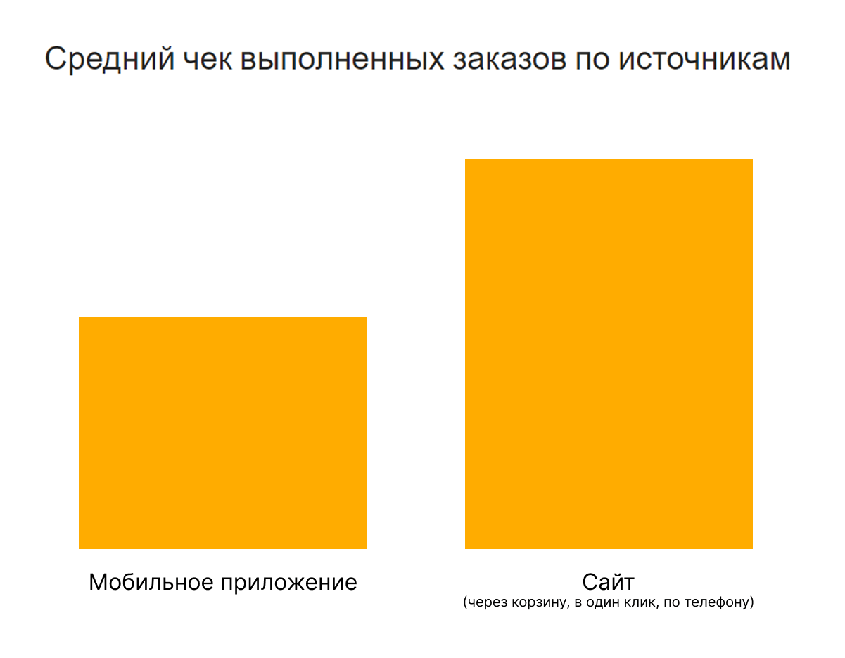 Мы знали, что средний чек в приложении ниже, чем на сайте, и решили выяснить, выгодна ли бизнесу миграция в приложение. Чтобы не полагаться только на средние значения, мы проанализировали распределение чеков по источникам заказов.