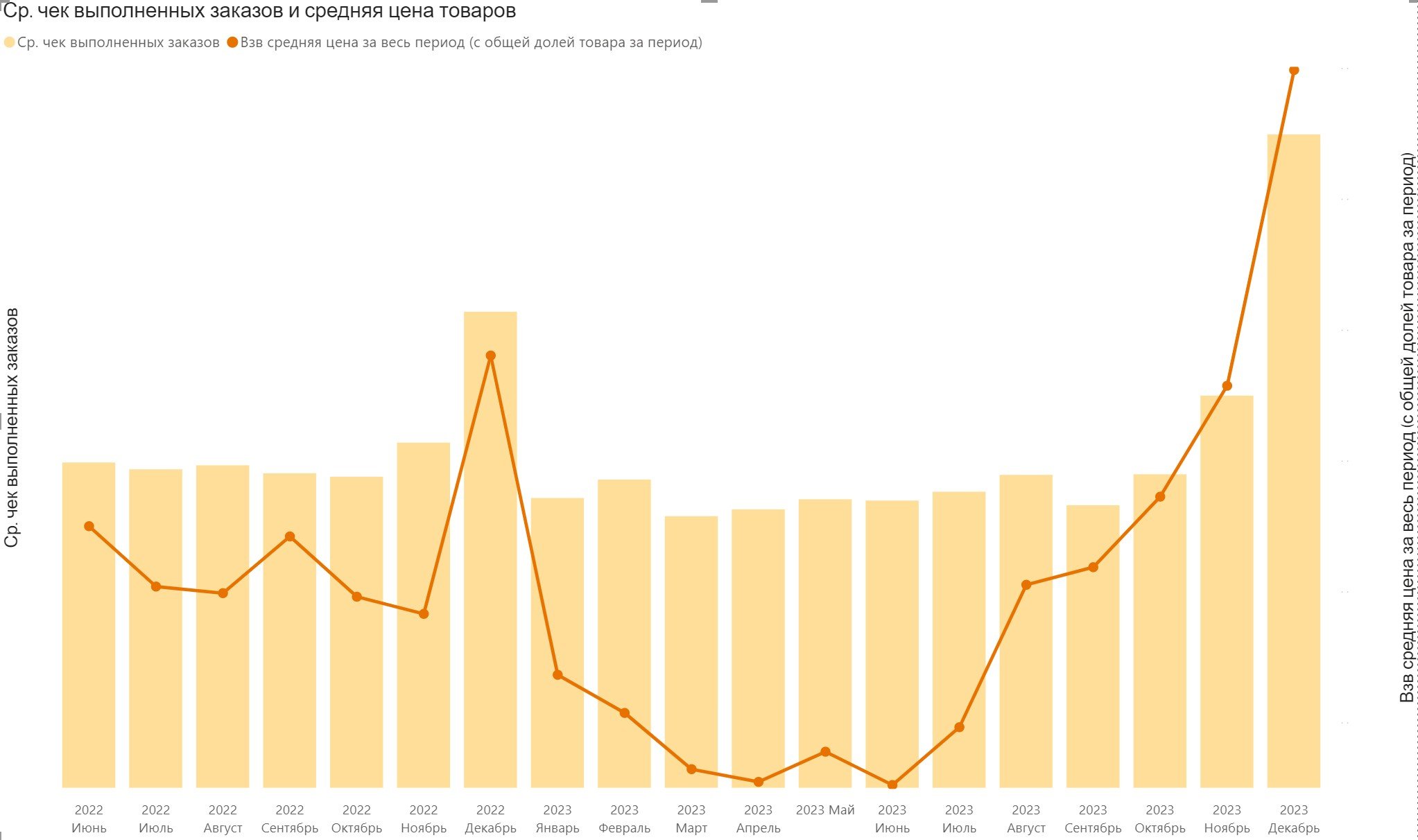 Мы вывели средний ассортимент товаров на протяжении всего рассматриваемого периода, чтобы убрать влияние праздников на корзину и отсматривать только изменение цены на товар. Обнаружили сильную зависимость среднего чека от изменения цены на товары.