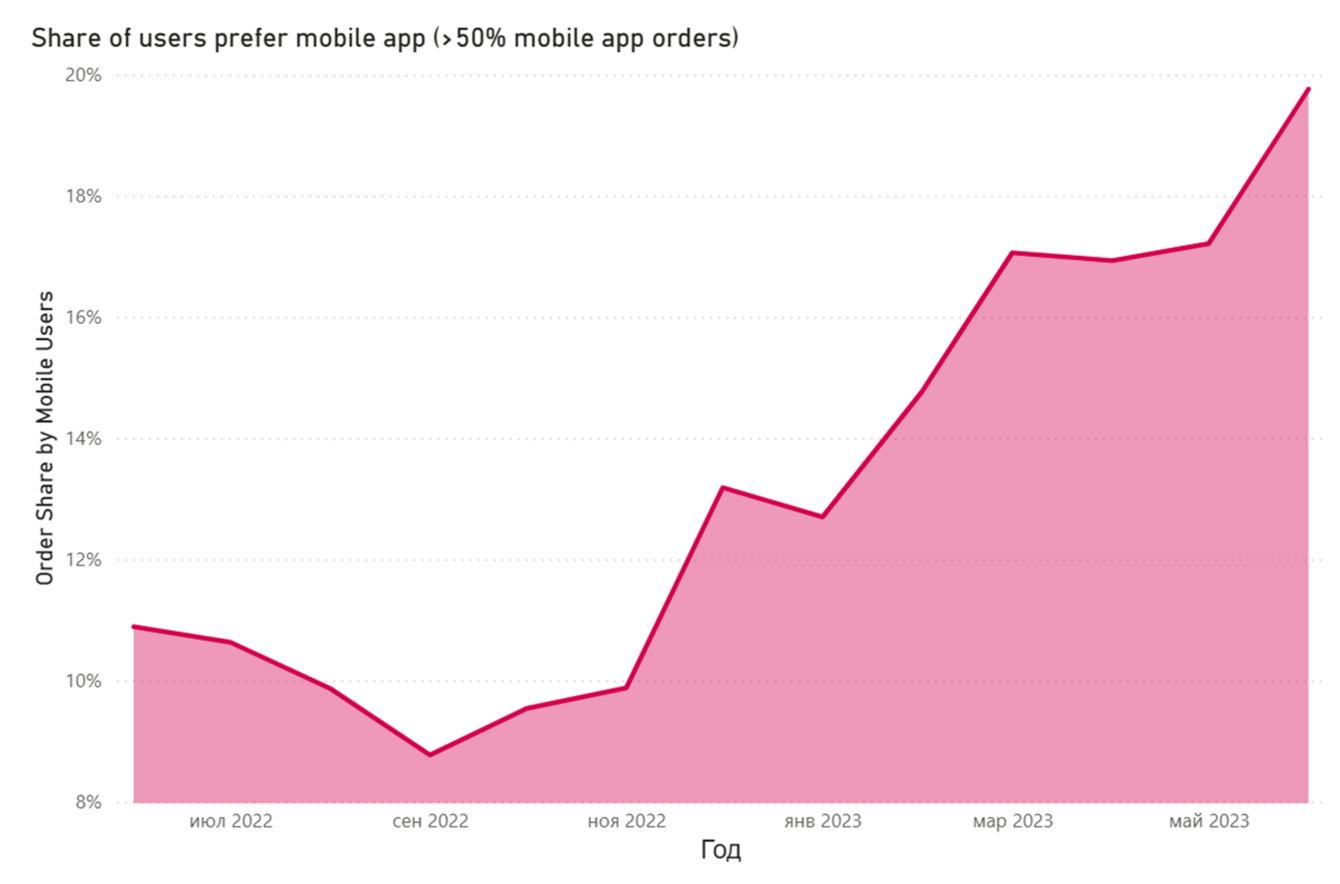 Замерили долю заказов в приложении. Она выросла до 20% за полгода.
