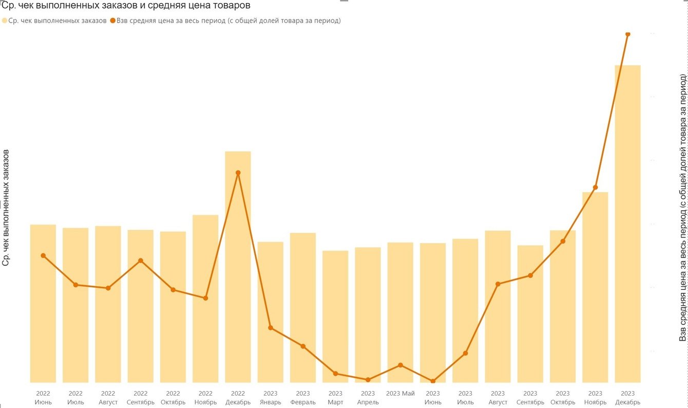 Динамика среднего чека и взвешенной средней цены покупаемого товара.