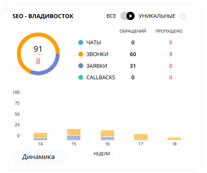 Чтобы понять, насколько привлекаемый трафик конвертируется в лиды, мы подключили коллтрекинг. К апрелю 2025 зафиксировали пик активности: 60 уникальных звонков и 31 целевая заявка только с органики: