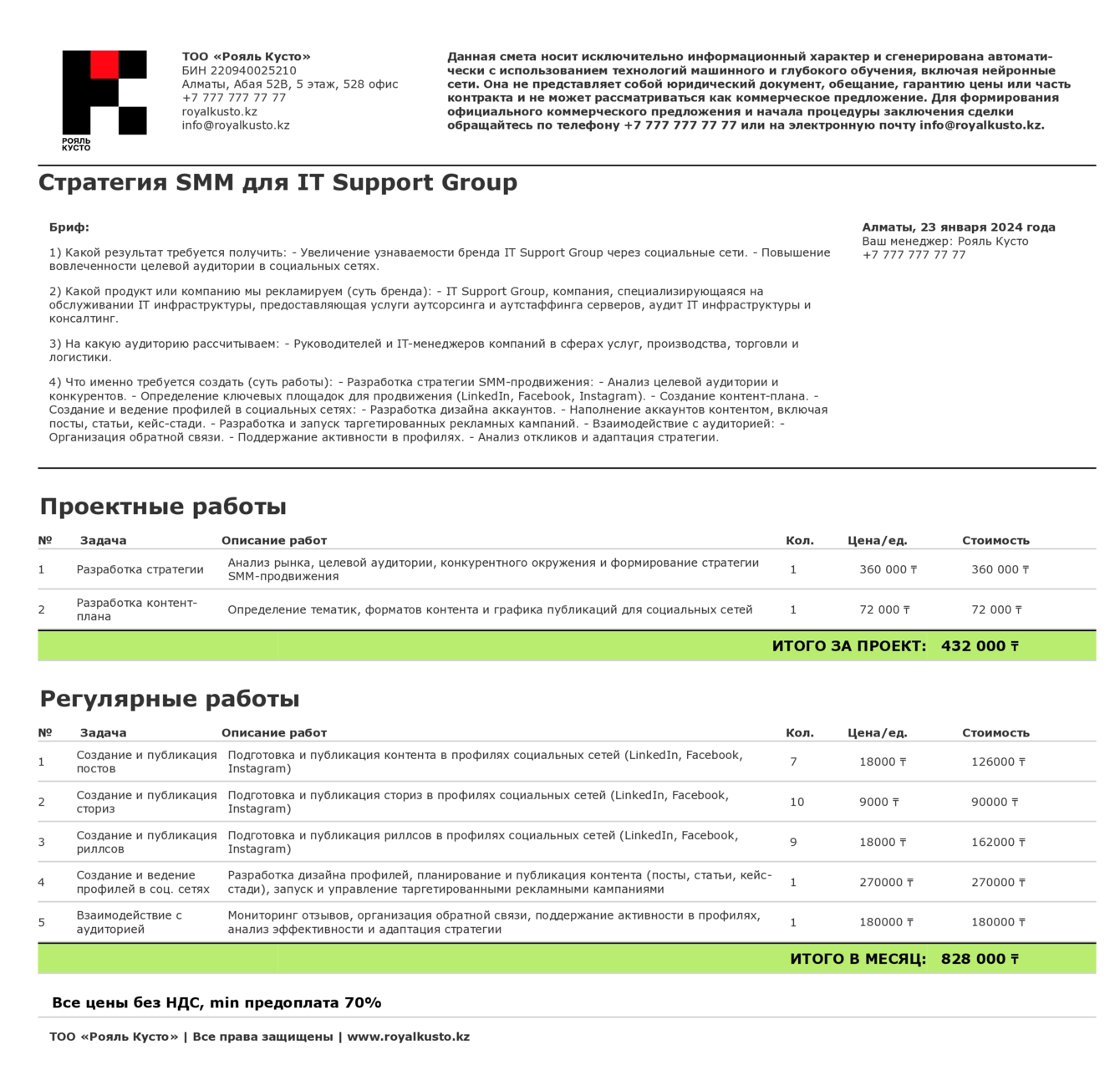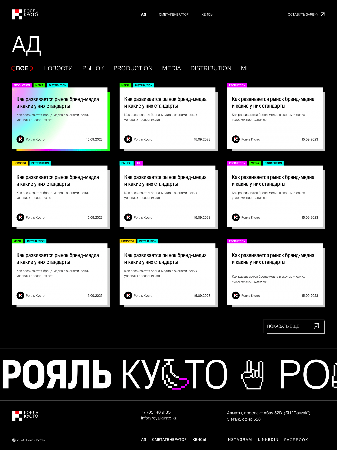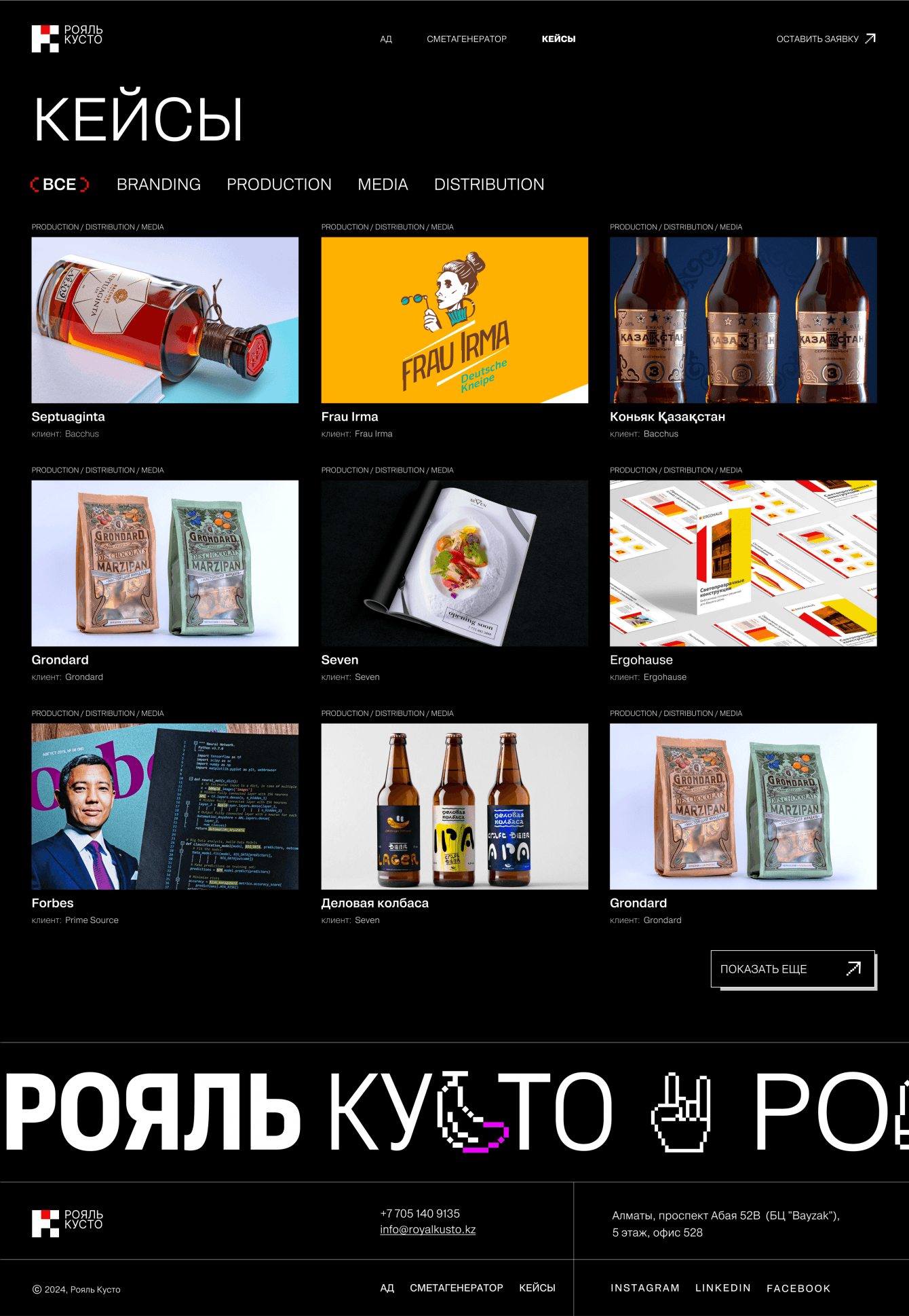Рояль Кусто – прогрессивное маркетинговое агентство из Алматы, которое специализируется на брендинге, продакшене, медиа и дистрибуции контента.