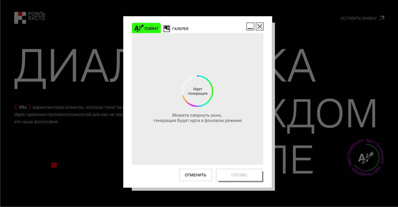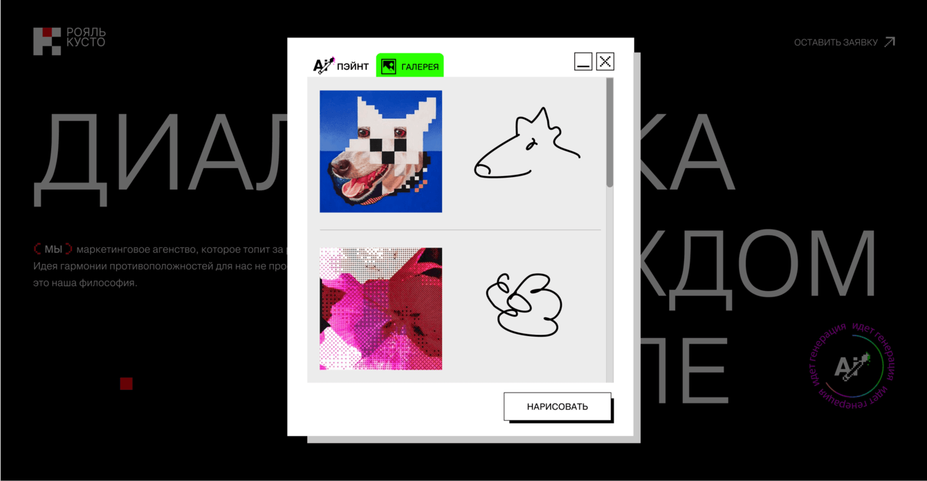Интеграция технологии Stable Diffusion в инструмент Paint открыла новые горизонты для креативности потенциальных клиентов агенства. Эта функция позволяет пользователям загружать собственные эскизы или рисунки, которые затем обрабатываются и дополняются с использованием искусственного интеллекта, обученного на фирменном стиле агентства. Таким образом, клиенты могут в реальном времени видеть, как их идеи оживают в соответствии с уникальным брендовым стилем Рояль Кусто, что значительно обогащает визуальный аспект предложений и способствует более тесному взаимодействию между клиентами и агентством.