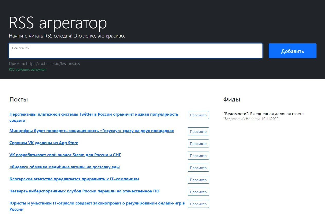 Выполнен небольшой проект под ключ - агрегатор RSS-лент. Добавление и обновление лент (фидов).