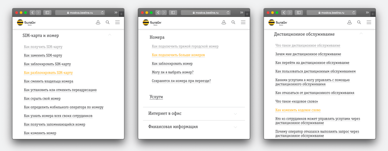 Написали более 300 вопросов и ответов по всем ключевым продуктам и услугам. Пока опубликованы не все подразделы помощи, но уже сейчас пользователи лучше понимают, как получить максимум пользы от продуктов и услуг Билайн Бизнес.