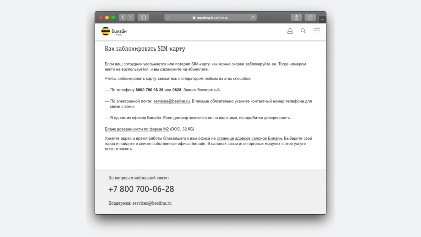 Упростили клиентам работу. Мы старались максимально сократить количество действий, необходимых для решения проблемы. Если для подключения услуги нужно позвонить оператору — сразу писали номер поддержки, если нужно отправить заявление на email — указывали ссылку на скачивание документа и почтовый адрес.