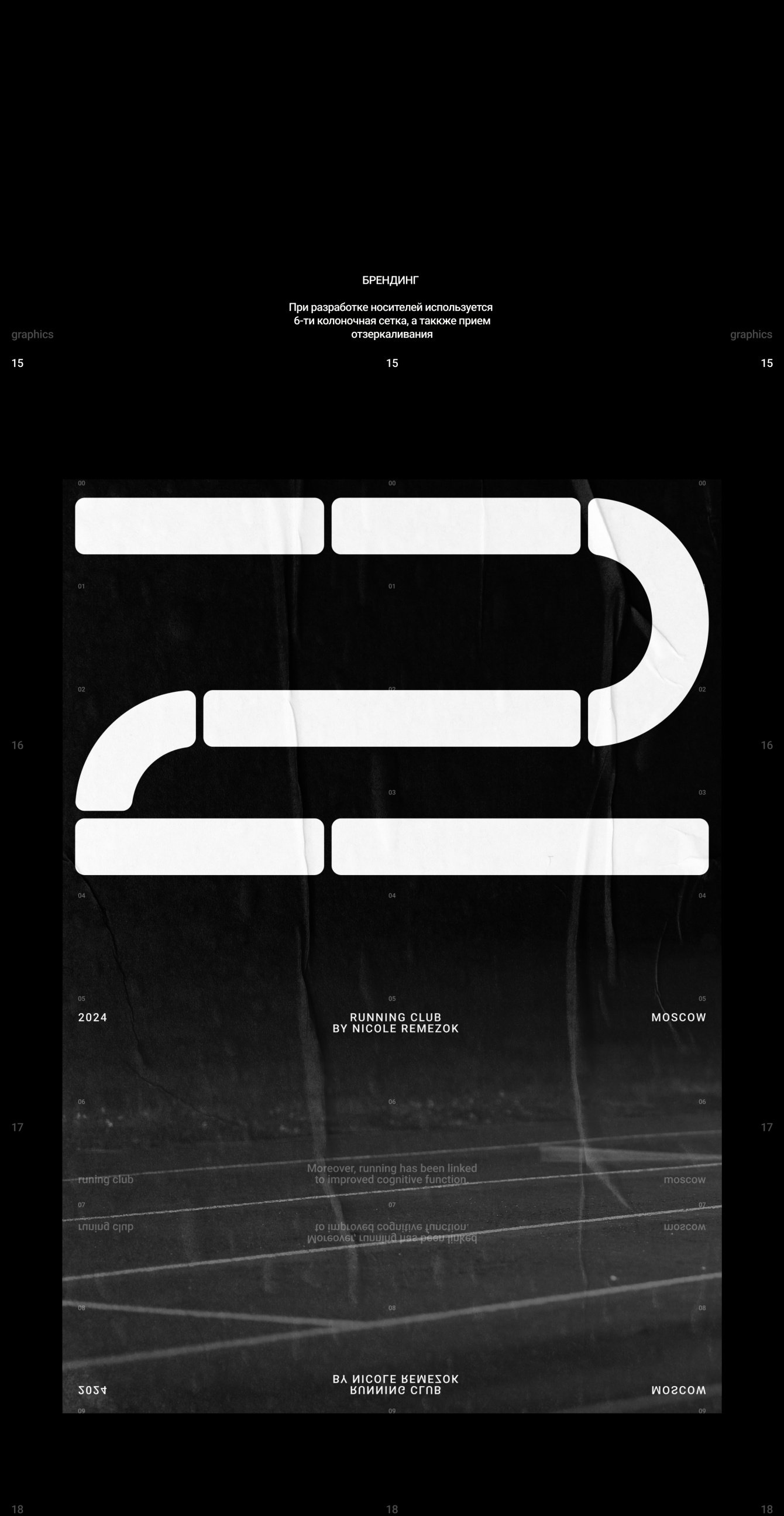 В рамках брендинга мы использовали 6-колоночную сетку, что обеспечивает визуальную гармонию. Также применен прием отзеркаливания, чтобы усилить ассоциации с движением и ритмом.