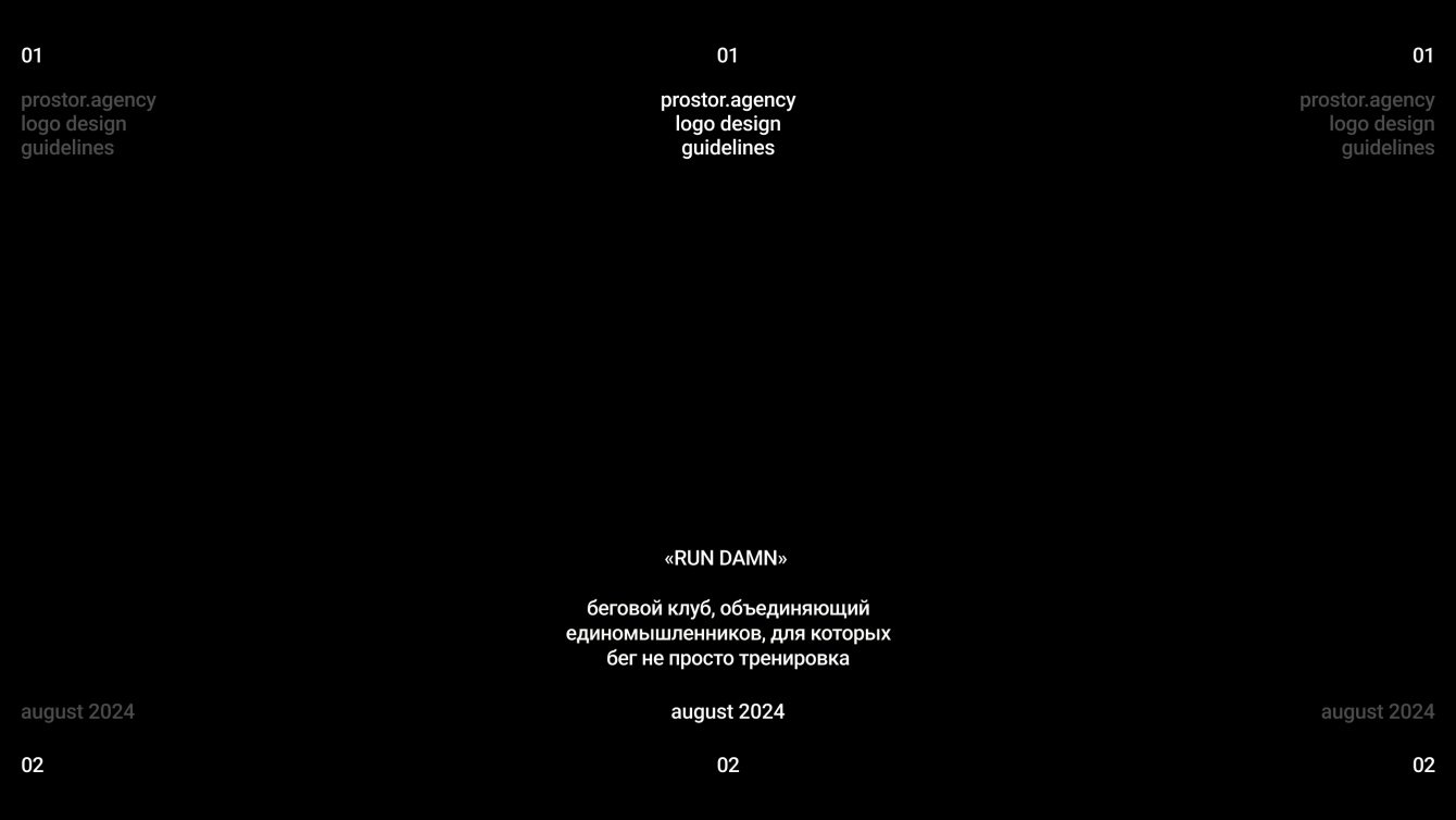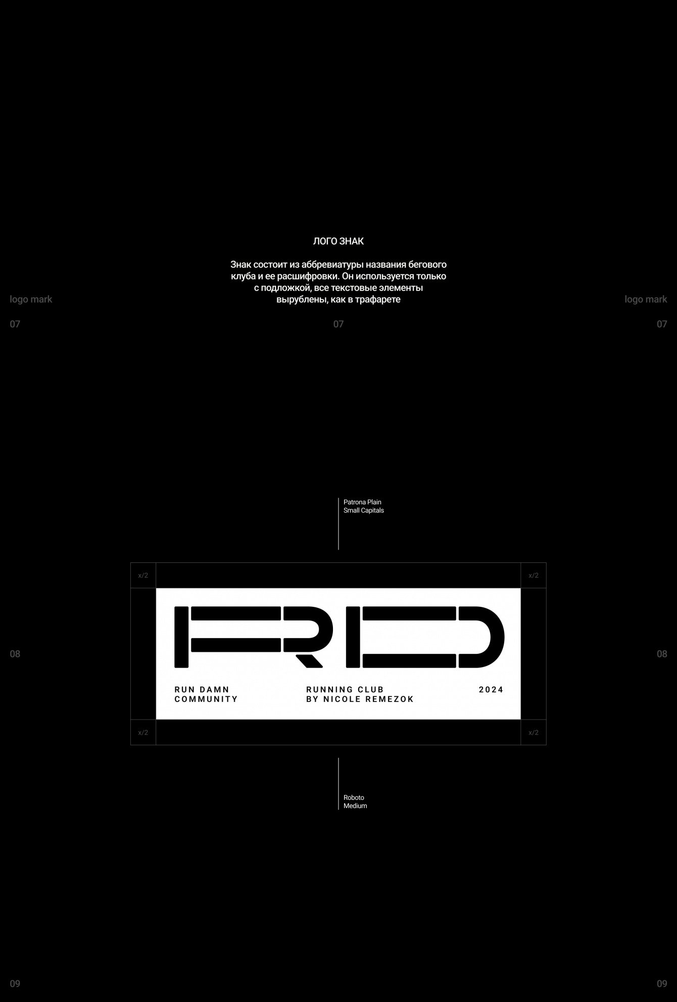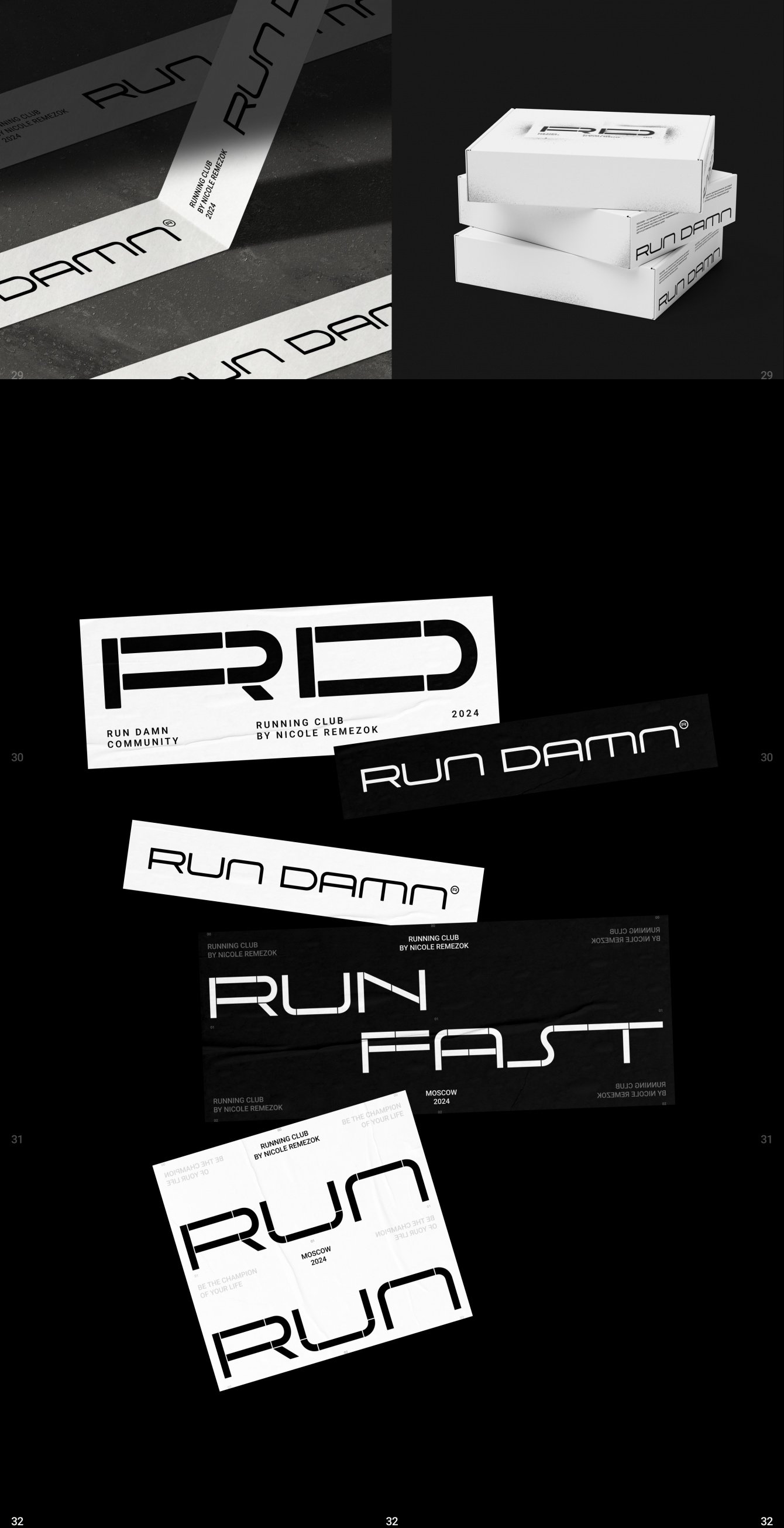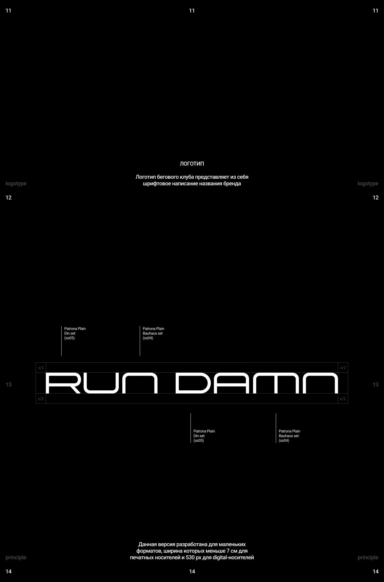 • Логотип: Основной логотип выполнен в шрифтовом написании названия клуба RUN DAMN, что обеспечивает читабельность и универсальность. Для маленьких форматов (ширина менее 7 см на печати и 530 px в digital) была разработана адаптированная версия.