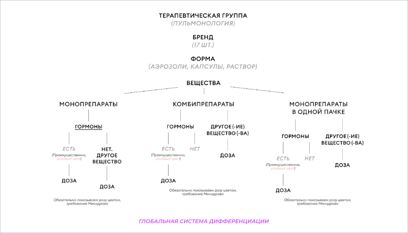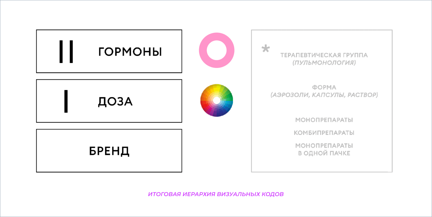 Вторым этапом мы нашли квалифицированного фармацевта на стороне клиента, и провели с ним интервью. Он поделился с нами опытом взаимодействия с большим количеством препаратов в аптеке. Благодаря полученной информации, мы сократили нашу глобальную дифференциацию до простой иерархии визуальных кодов.