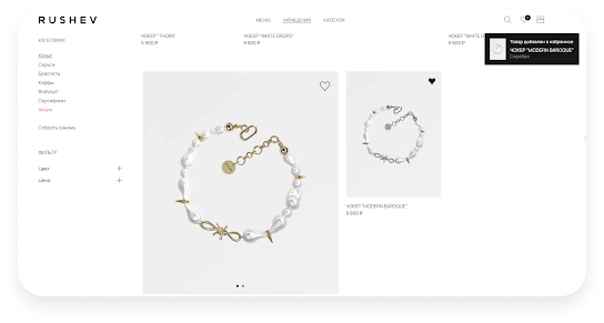 Понравившиеся товары можно не только добавить, но и убрать из “Избранного” одним нажатием мышки. При добавлении в избранное, всплывающий попап покажет и подскажет, какое украшение вы добавили себе в коллекцию.
