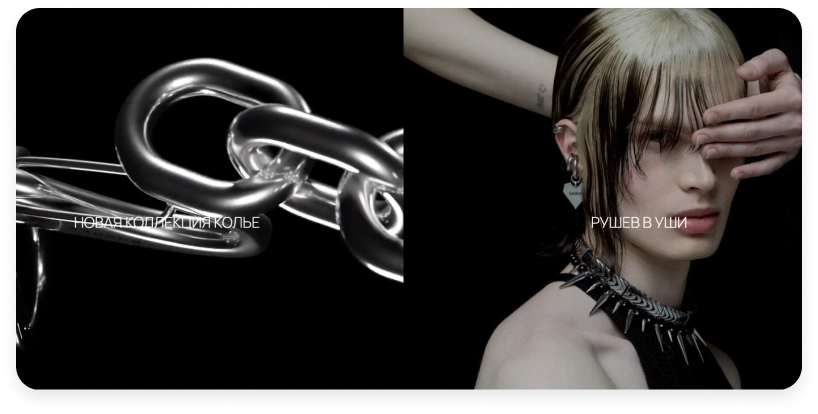 Сетка каталога представлена в необычном формате. Некоторые карточки выделяются размером, так пользователь может лучше рассмотреть детали украшения, при этом продолжив скроллинг.