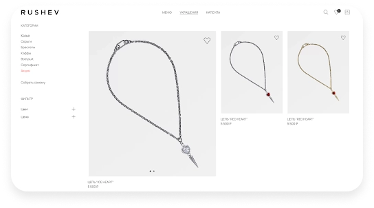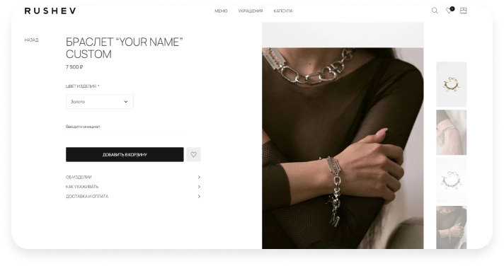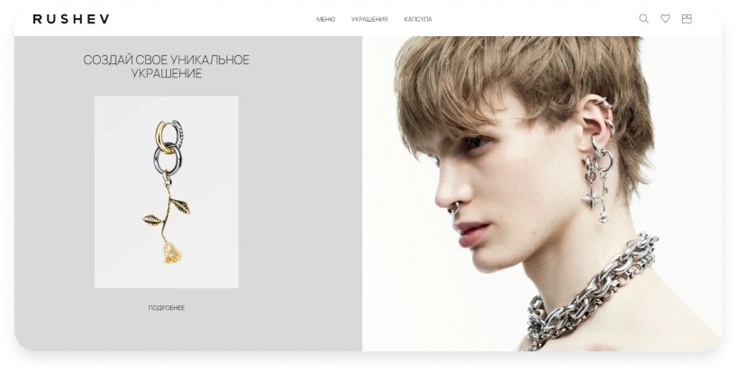 У RUSHEV есть уникальное предложение — “Собрать украшение самому”. Рассказывая сразу об этой возможности, посетители еще больше захотят углубится в изучение сайта.