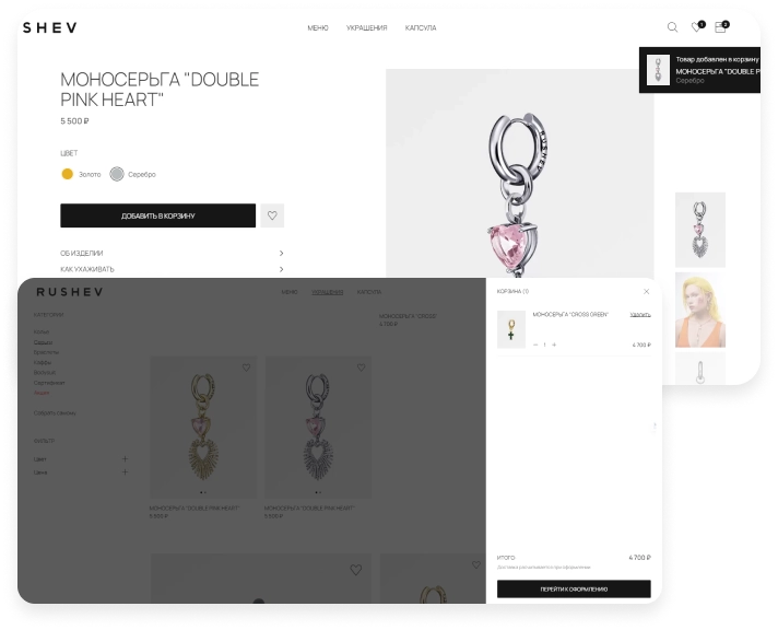 Корзина покупателя настроена в виде всплывающего окна и не отвлекает от просмотра каталога. А при добавлении украшения в корзину всплывает уведомление, как с добавлением в “Избранное”.