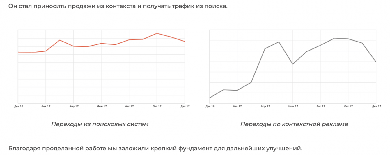 «Мы пообщались с клиентом и поняли, что проблема не в запросах, а в отсутствии продаж. Здесь нужен был комплексный подход в рекламе (SEO, контекст) и переделка сайта. Мы предложили варианты действий на время разработки сайта и стратегии и начали подготовку рекомендаций для нового сайта: структура каталога, тексты, новый функционал».