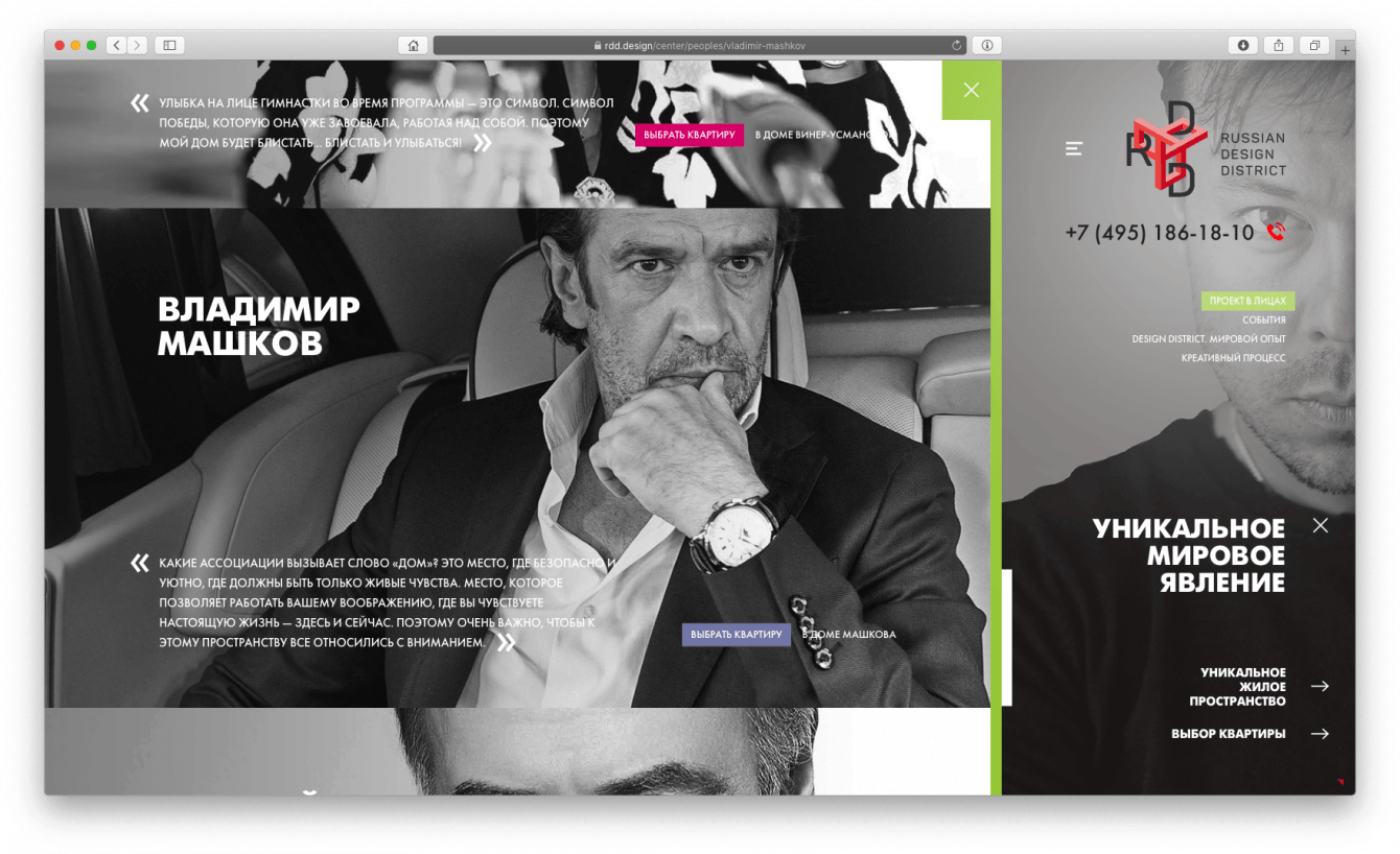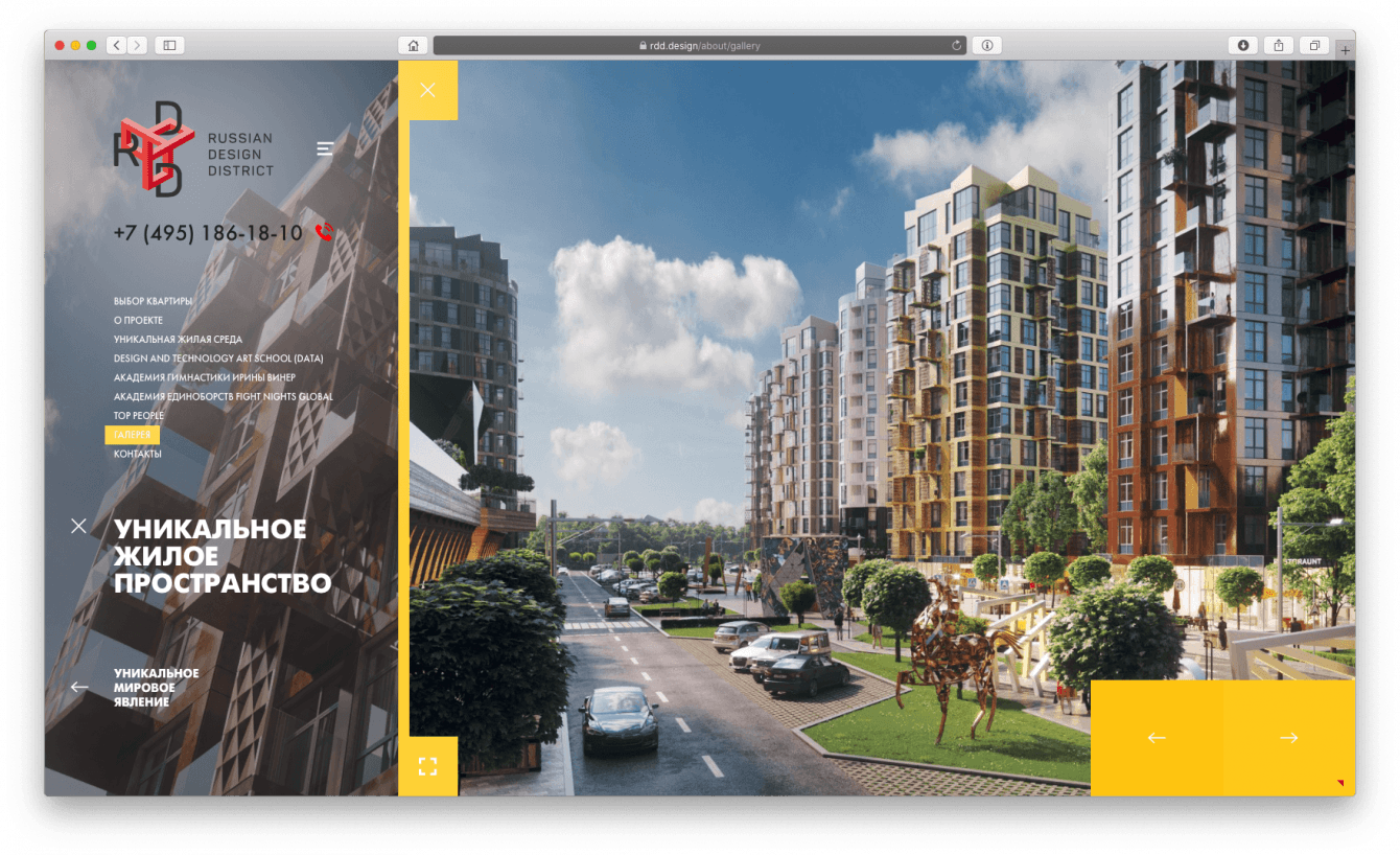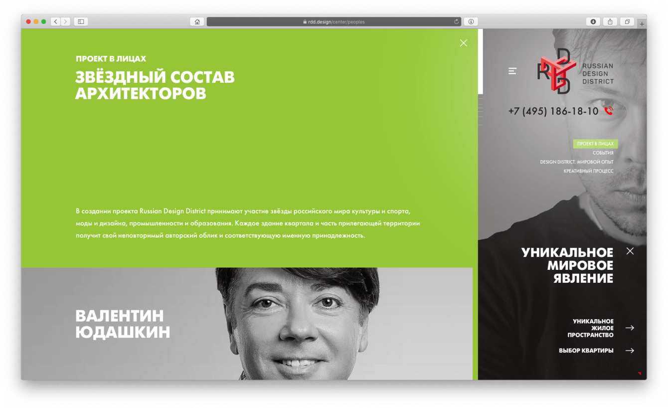 Сайт RDD – нестандартный, как и сам проект. Концептуально он поделён на две части: мировое явление (звездный состав архитекторов, события, мировой опыт) и жилое пространство (выбор квартир, жилая среда, инфраструктура проекта, галерея и т.д.).