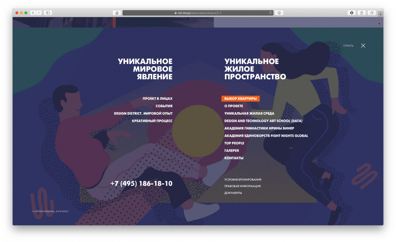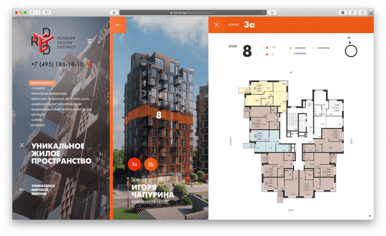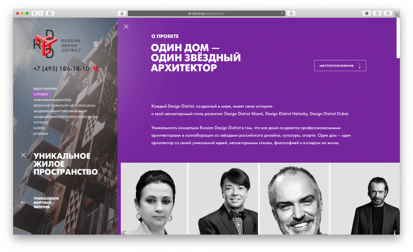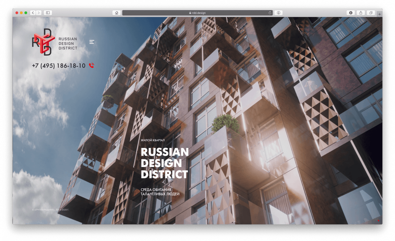 Сайт RDD – нестандартный, как и сам проект. Концептуально он поделён на две части: мировое явление (звездный состав архитекторов, события, мировой опыт) и жилое пространство (выбор квартир, жилая среда, инфраструктура проекта, галерея и т.д.).