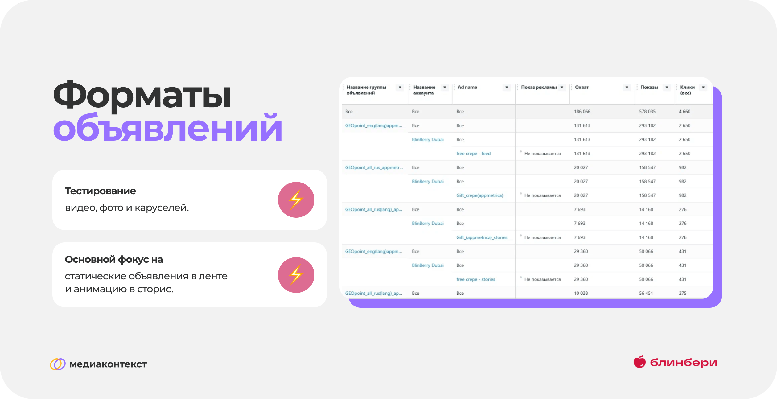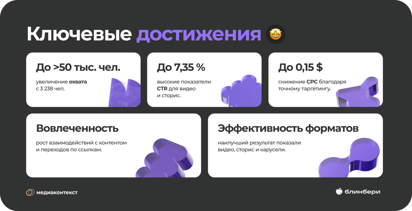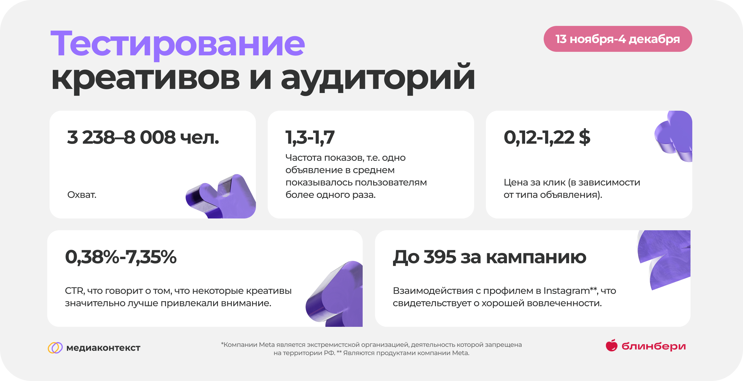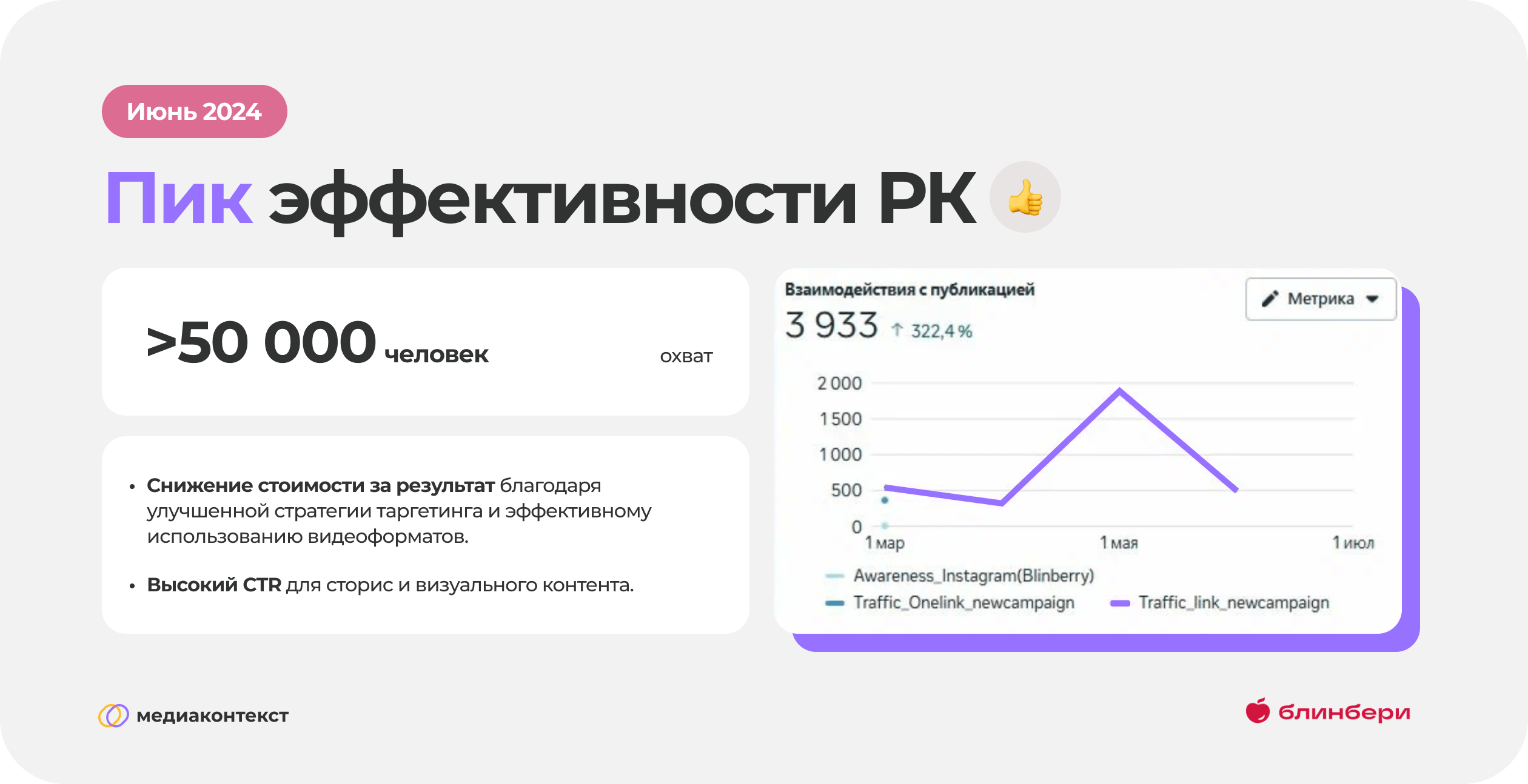 Основной подход заключался в «сужении воронки продаж» — обеспечении максимального охвата целевой аудитории с последующим перенаправлением трафика на профиль в Instagram и приложение через onelink.ru.