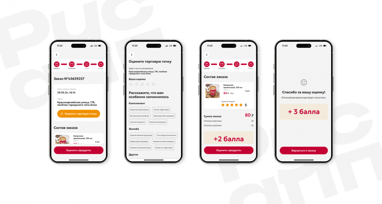 Бонусная программа — важная часть бизнес-логики заказчика, которая имеет большое значение в удержании и привлечении новых клиентов. Кроме покупок, бонусные баллы можно заработать в приложении, если оценивать товары из своих заказов: за каждую оценку пользователь получает от 2 до 5 баллов.