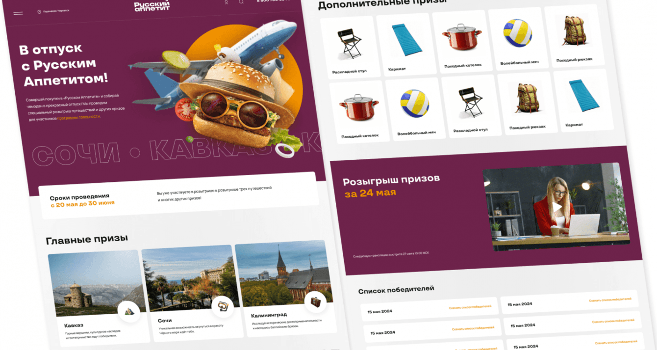 Например, в 2024 заказчик решил провести большой розыгрыш призов и разыграть среди участников поездки в Сочи, Калининград и на Северный Кавказ и 300+ других подарков. Для этого мы заранее:
