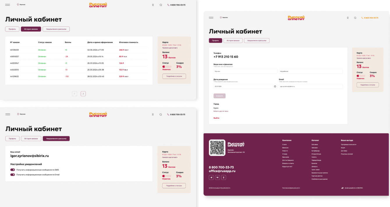 Несмотря на то, что на сайте ничего нельзя заказать, тут есть личный кабинет. Авторизованным пользователям доступны персональные акции и бонусная система: можно посмотреть количество начисленных бонусов, которые можно потратить при покупке в любой точке сети. Также в личном кабинете можно посмотреть историю заказов.