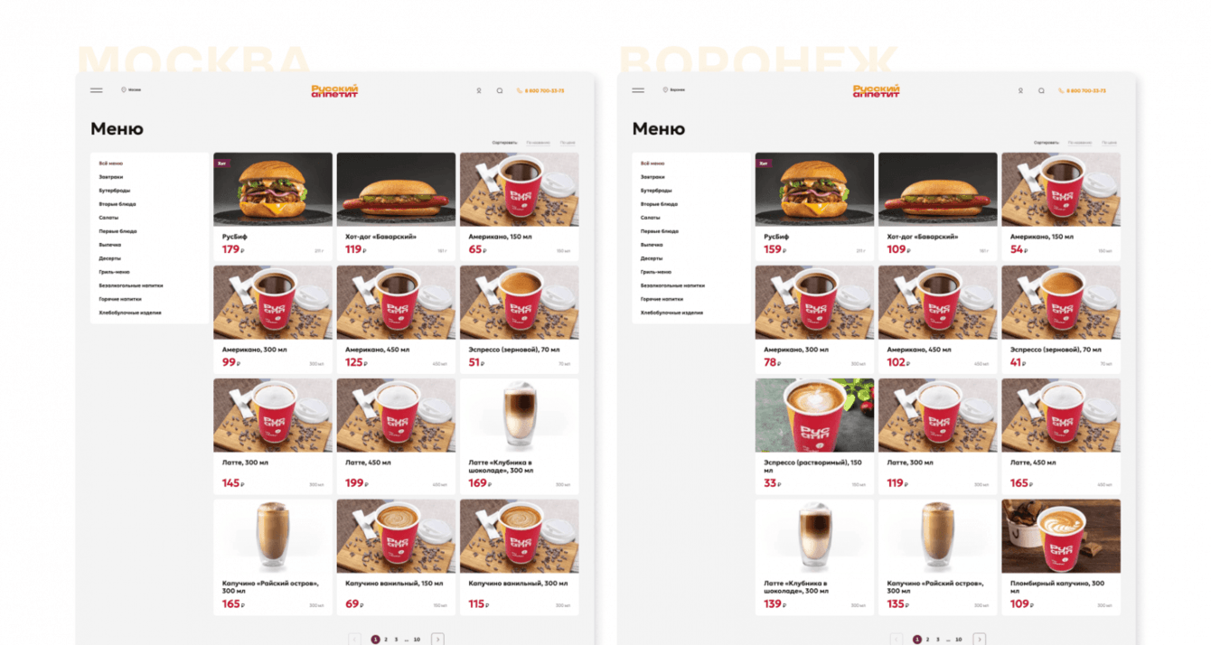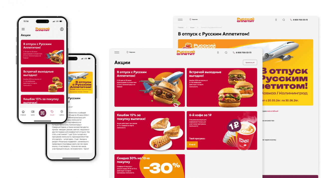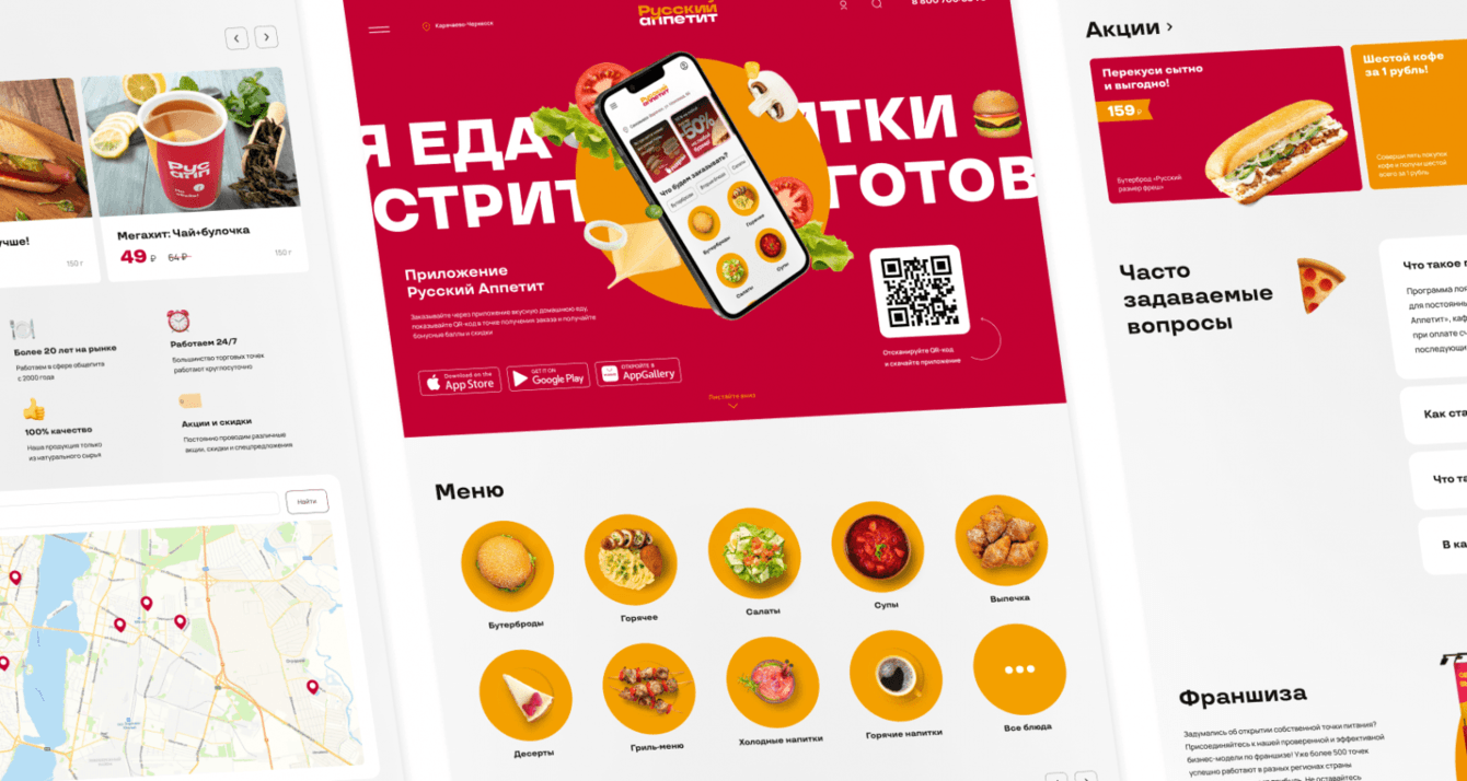 В этом кейсе история ещё интереснее. Сайт на проекте носит больше информационную функцию: здесь можно посмотреть каталог, но заказать блюда не получится — для этого нужно прийти в киоск сети (либо сделать заказ через приложения подрядчиков — Яндекс. Еда или Маркет Деливери). Штука среди клиентов сети популярная — многие ей пользуются именно из-за бонусов.
