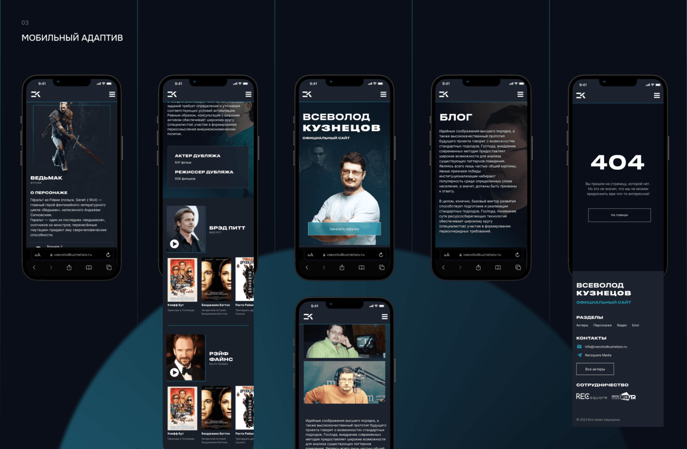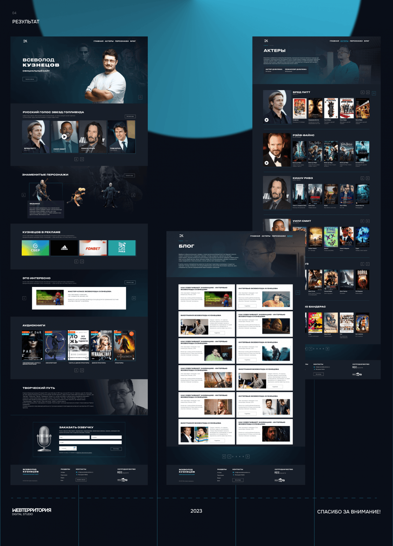 В итоге получился лаконичный и профессиональный сайт, эффективно представляющий достижения Всеволода Кузнецова в сфере дубляжа.