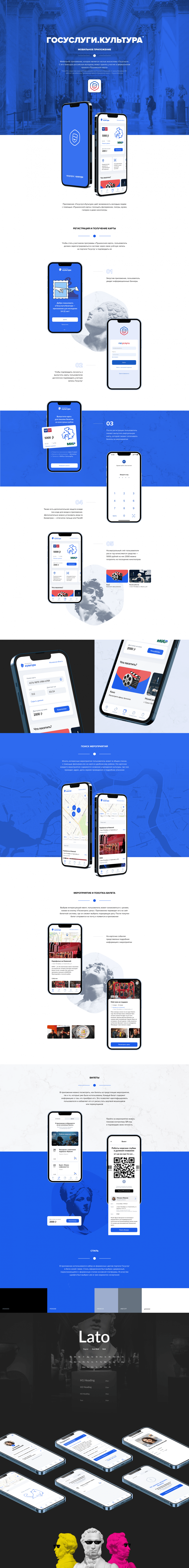 Использовали набор из фирменных цветов портала «Госуслуги» в бело-синей гамме и шрифт Lato в трех вариантах начертания.