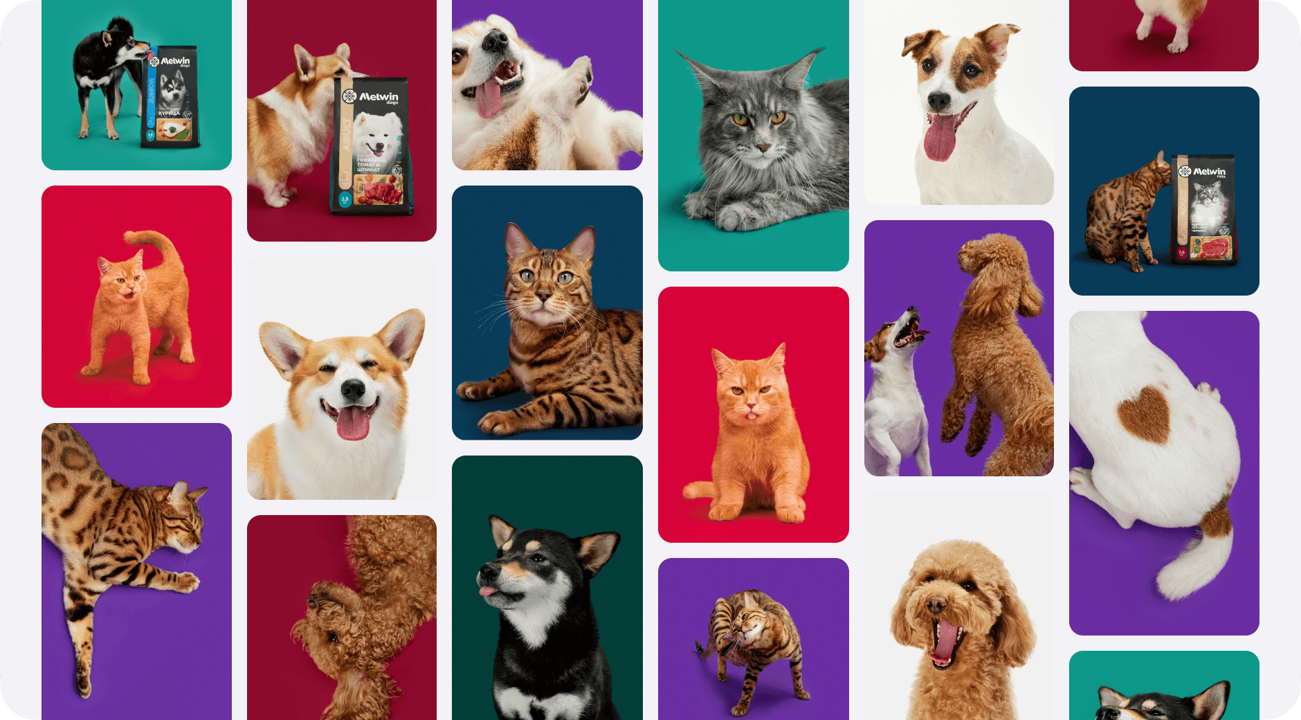 «Идеальные» фотографии питомцев со стоков нам совсем не подходили, поэтому мы провели собственную съемку — креативную и вдохновлённую брендом. Все просто: цвета бренда, животные, предоставленные сами себе, и корм. Получили живые, игривые фото и видео с неидеальными, но такими любимыми питомцами.
