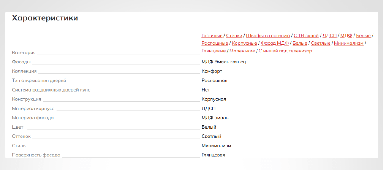 - Добавили фильтруемые характеристики (ширина, высота, глубина) и статусы. Это сделало страницы более информативными и релевантными, повысило удобство выбора.