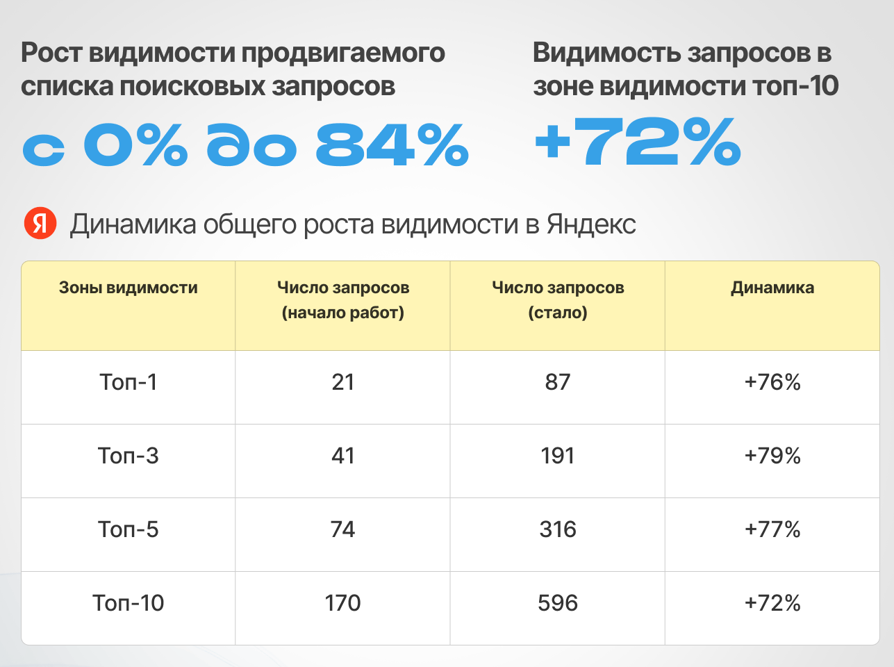 - в Яндекс видимость выросла с 0% до 84%,