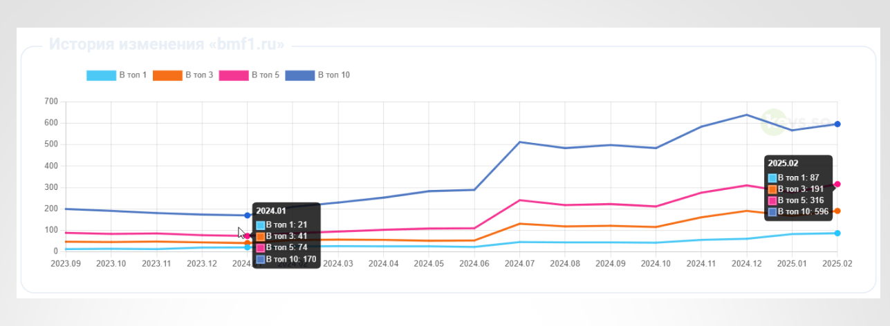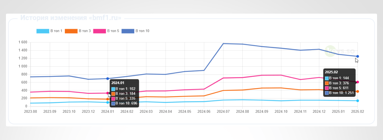За 12 месяцев работы сайт bmf1.ru показал стабильный рост видимости и позиций в поисковых системах.