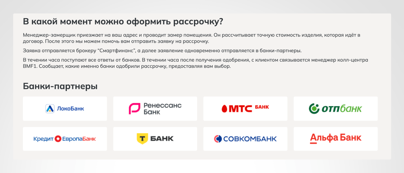 - Рассрочка — описали доступные программы и требования.