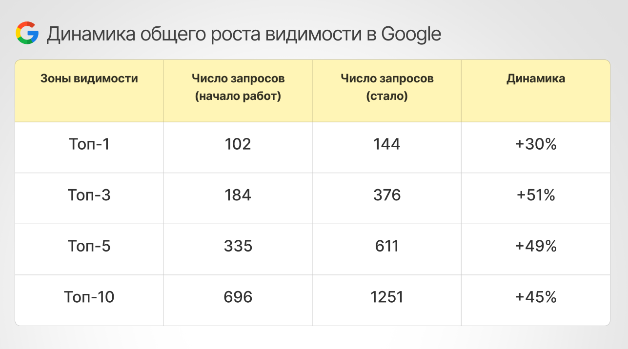 - Google: +45% (с 696 до 1251 запроса).