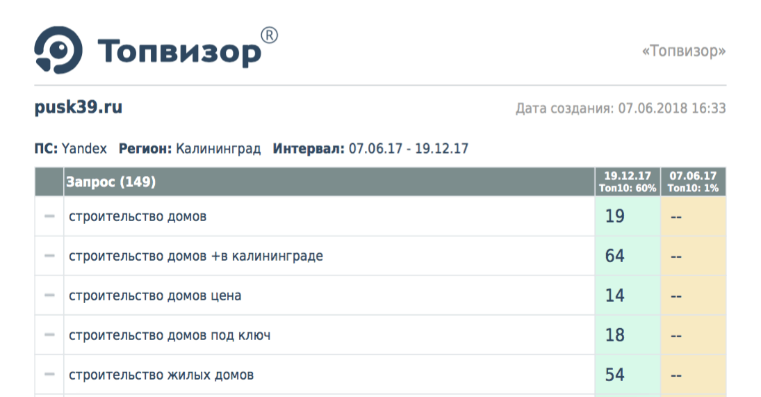 Клиент: строительная компания. Задача: вывести в ТОП-10 60% запросов из ядра, в том числе ВЧ по тематике