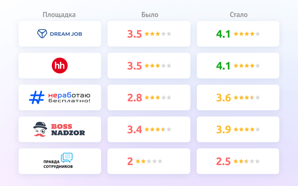 В результате всего за три месяца ситуация изменилась кардинально. Компания вышла из зоны репутационного кризиса: средний HR-рейтинг вырос с 2,68 до 3,8, а на ключевых площадках показатели стабильно закрепились выше 4,0.