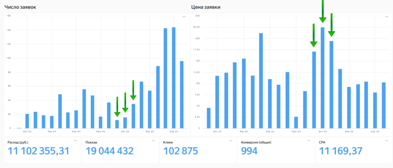 Месяцы, отмеченные стрелками, — периоды работы других подрядчиков по рекламе