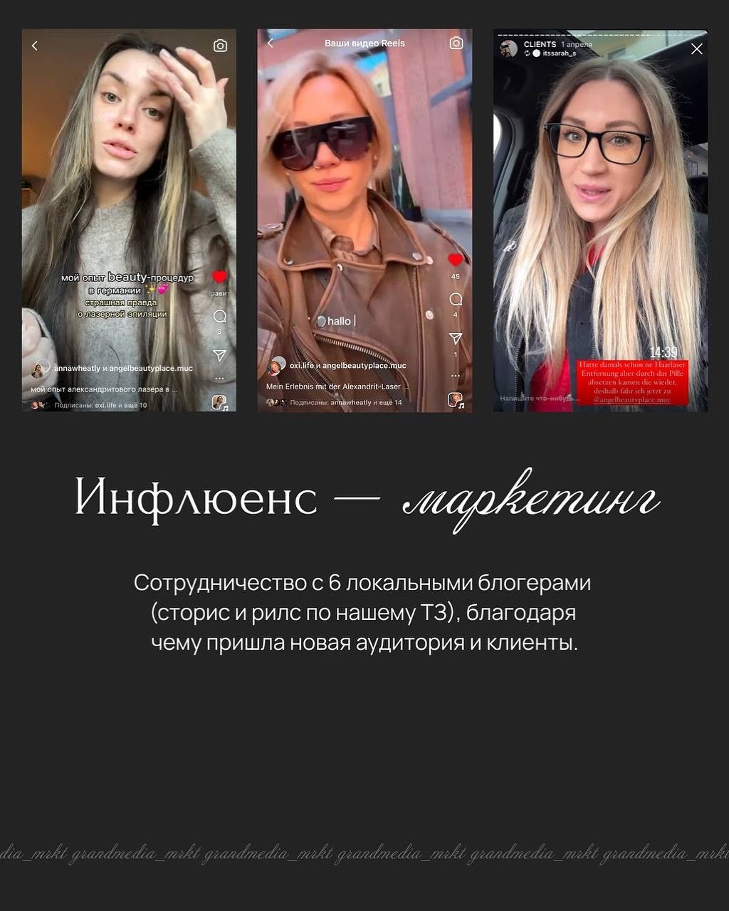 После комплексной упаковки и настройки коммуникаций соцсети салона красоты Angel Beauty стали работать как полноценный маркетинговый инструмент. Мы выстроили понятную систему разработки и постинга контента, усилили имидж бренда в Мюнхене и подготовили сильнейший фундамент для дальнейшего развития.