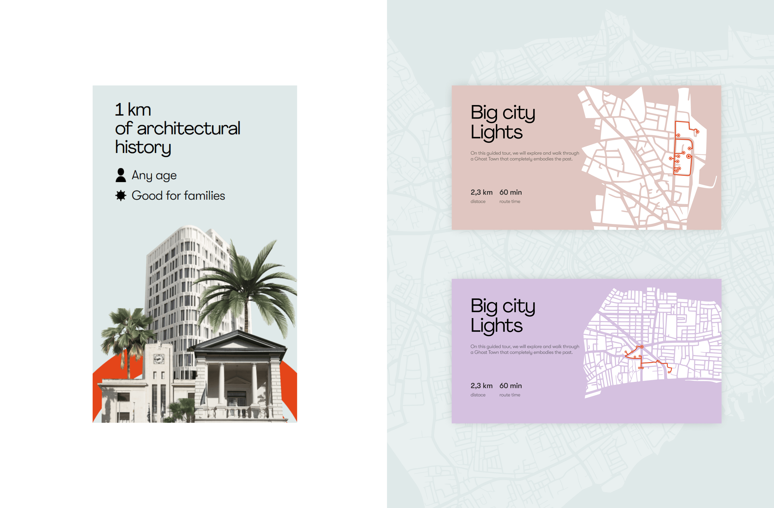 Всего в гиде — 5 маршрутов. Мы долго думали, как бы каждый из них сделать особенным. В итоге решили, что можно собирать коллажи для каждого маршрута из фото основных точек. Клиенту идея понравилась.