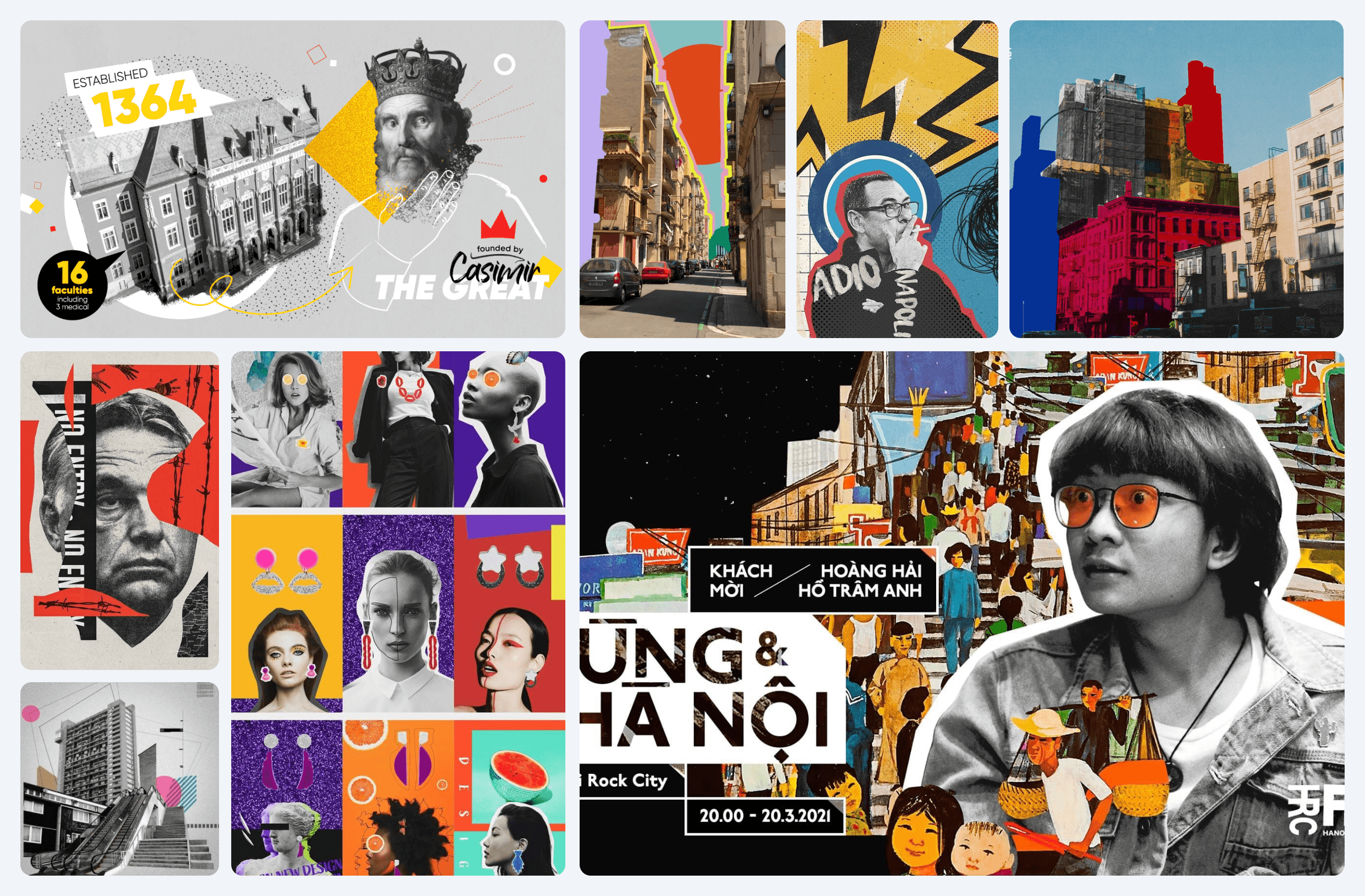 Второй вариант сделали поярче: чёрно-белые фотографии с контрастной обводкой на кислотном фоне и кругами из брендинга.