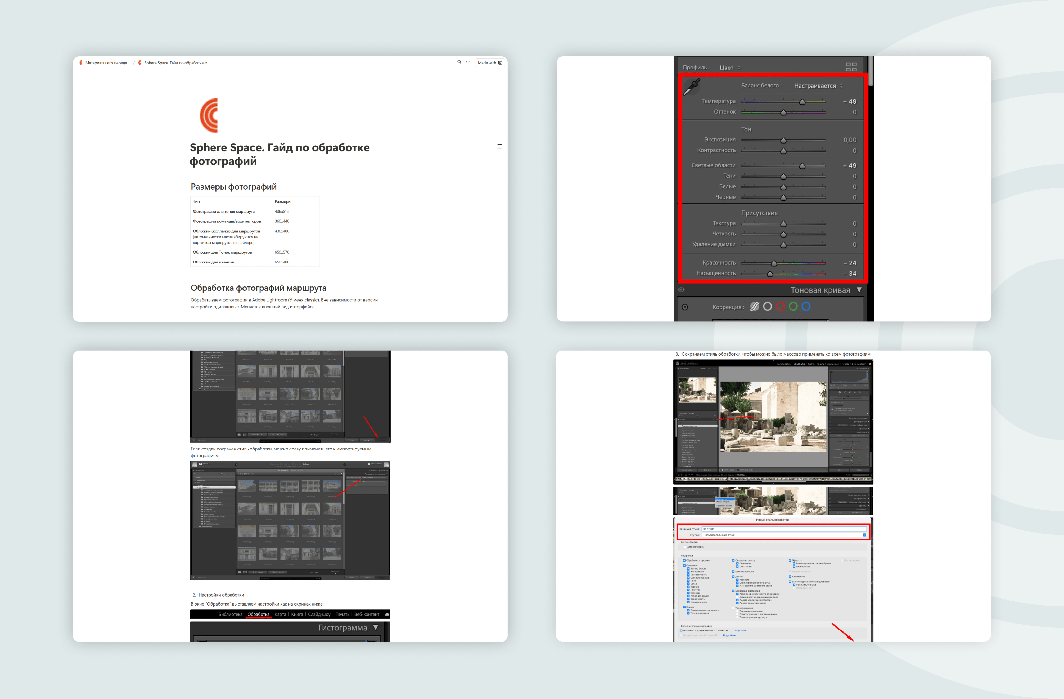 Чтобы подружить между собой фото, мы накинули на них тёплый пресет в песочных оттенках. Получилось немного ретро, в духе солнечного Кипра и с отсылкой к брендингу Sphere Space с желтоватым цветокором.