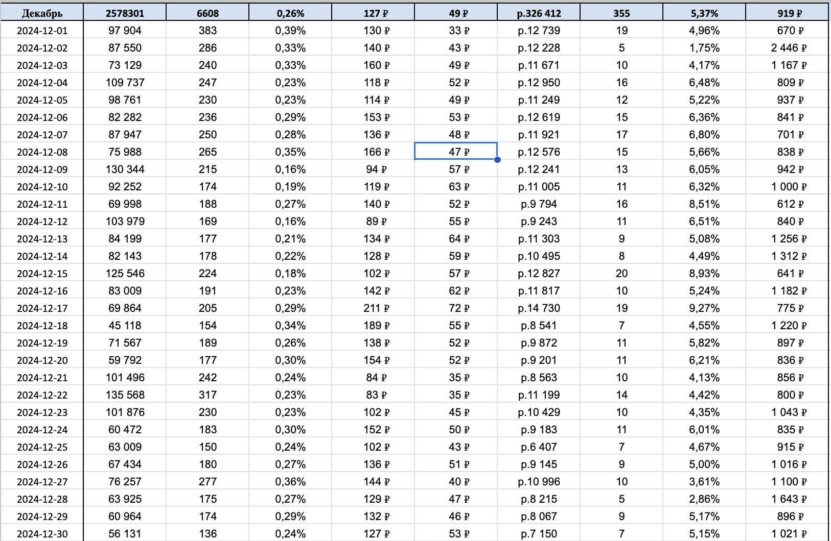 Понимая, что в декабре самый горячий аукцион, мы приняли решение сделать упор на стабильность и сохранение текущих показателей, из-за удорожания аукциона. Потому что в декабре, перед самым новым годом возможна просадка в окупаемости. Также в ноябре были запущены и новые РК, которым нужно было время оптимизироваться.
