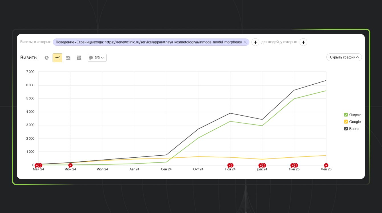 Это дало клинике дополнительные показы в блоках с врачами и усилило траст в медийной и чувствительной для Яндекса тематике.