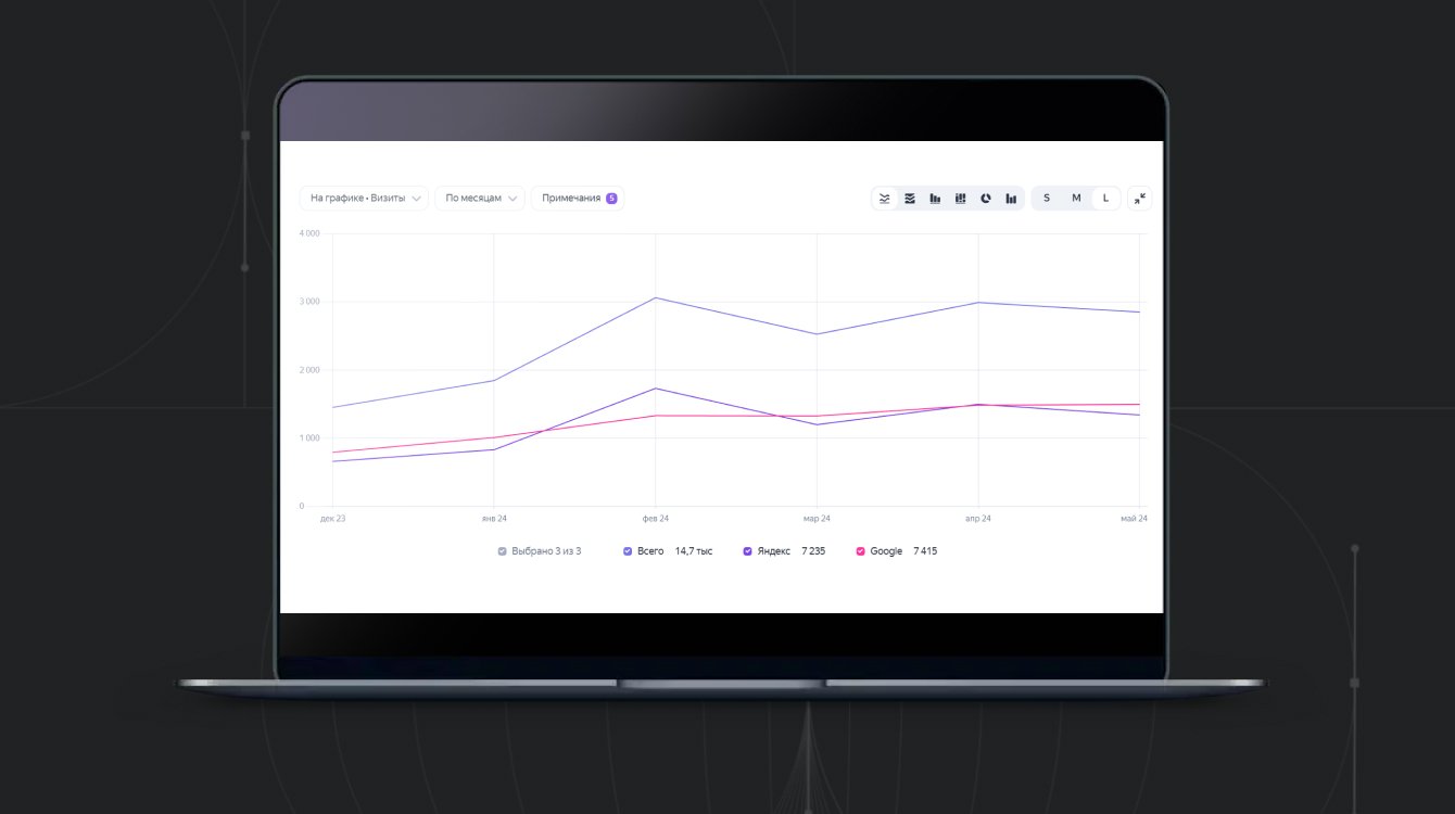 • Май 2024: 6 500 визитов из поиска, из них 2 870 – на раздел «Услуги».