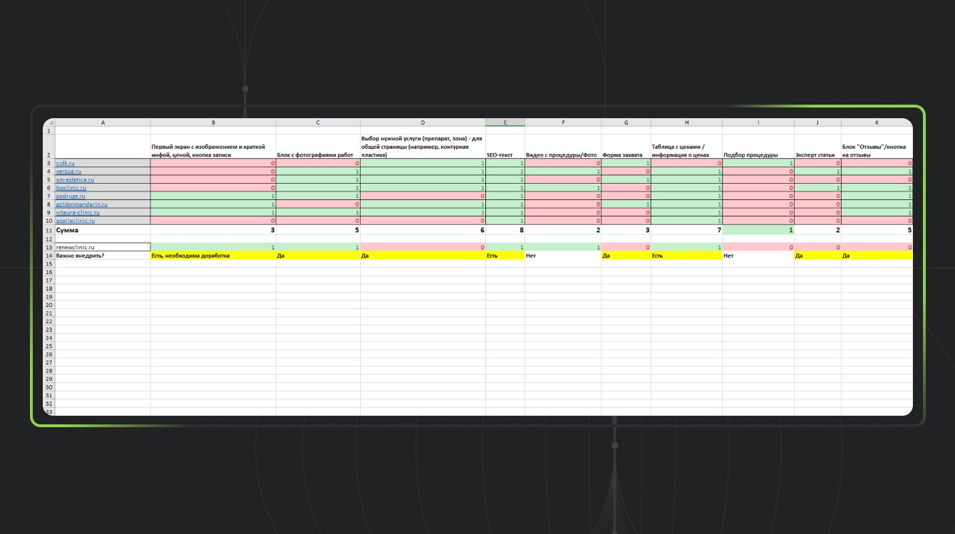 Проанализировали шаблоны лидеров и сформировали обязательный набор блоков для услуг: отзывы, цены, блок эксперта, до/после, SEO-текст, форма заявки. Страницы клиента этим требованиям не соответствовали, поэтому составили чек-лист недостающих блоков и заложили их в ТЗ.